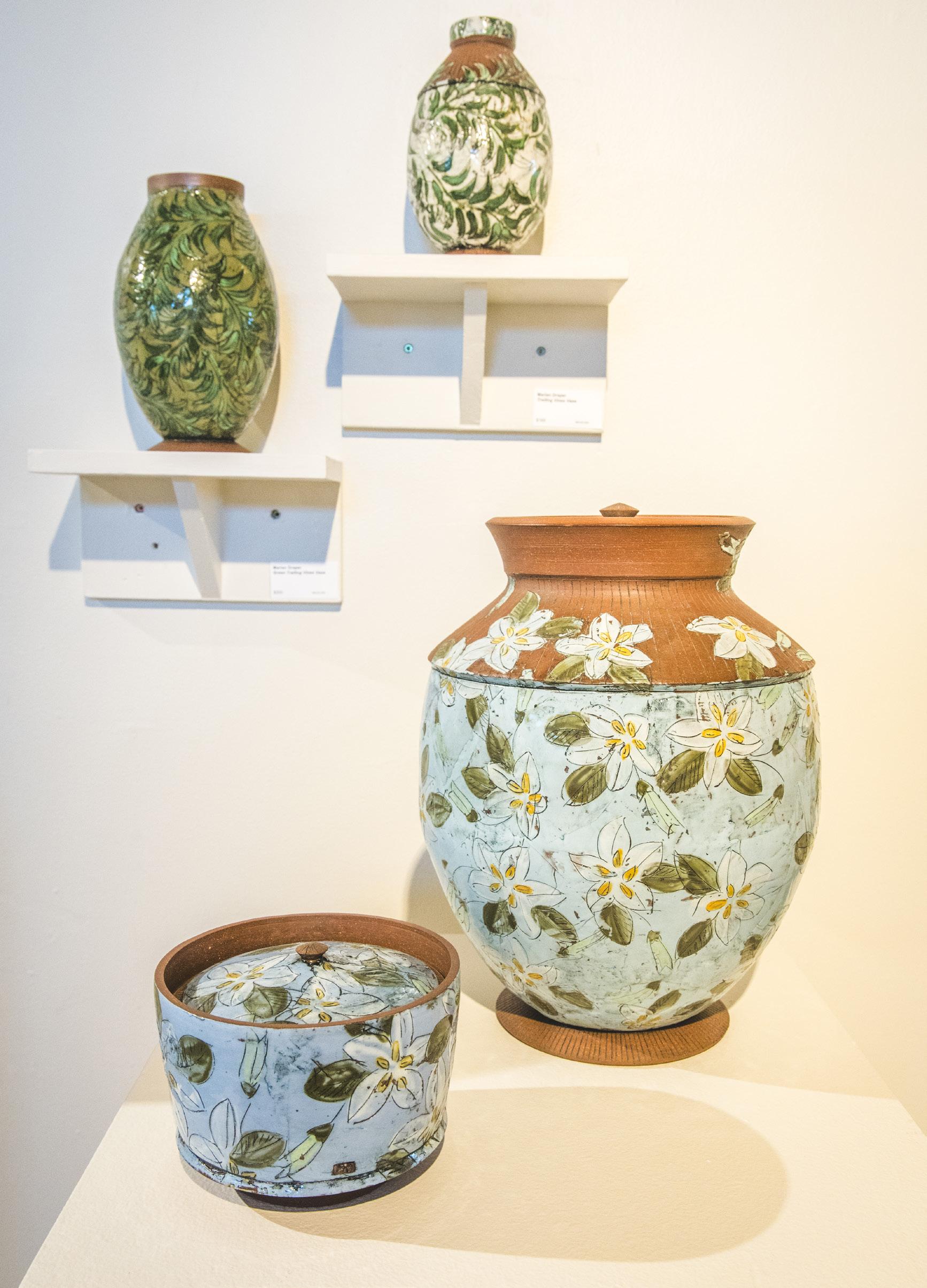 Marian Draper creates elegantly crafted, utilitarian vessels adorned with lush, floral motifs. Drawing inspiration from rich botanicals and historical textiles and wallpapers, Draper’s work merges a deep admiration for craft and form with a passion for colorful, ornate surfaces. Using underglaze, newsprint, and slip, Draper applies these motifs to generous, wheel-thrown forms. Carved linear lines enhance the vessels, complementing the delicate outlines of the floral designs.