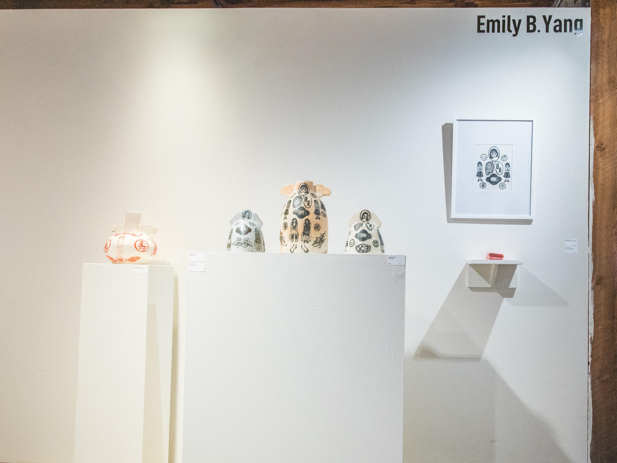 Emily B. Yang is a block print and ceramic artist. Her work explores the intersections of these two distinct craft processes, seeking to bridge the gap between large-scale printmaking and ceramic surface decoration. By referencing traditional symbols and methods of making, she aims to create new narratives that address diasporic storytelling and feminist cultural speculation.