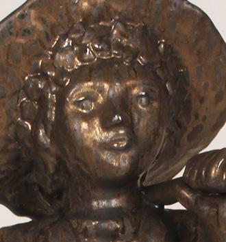 block printed and carved ceramic bell, gas-fired with silver luster, red ribbon