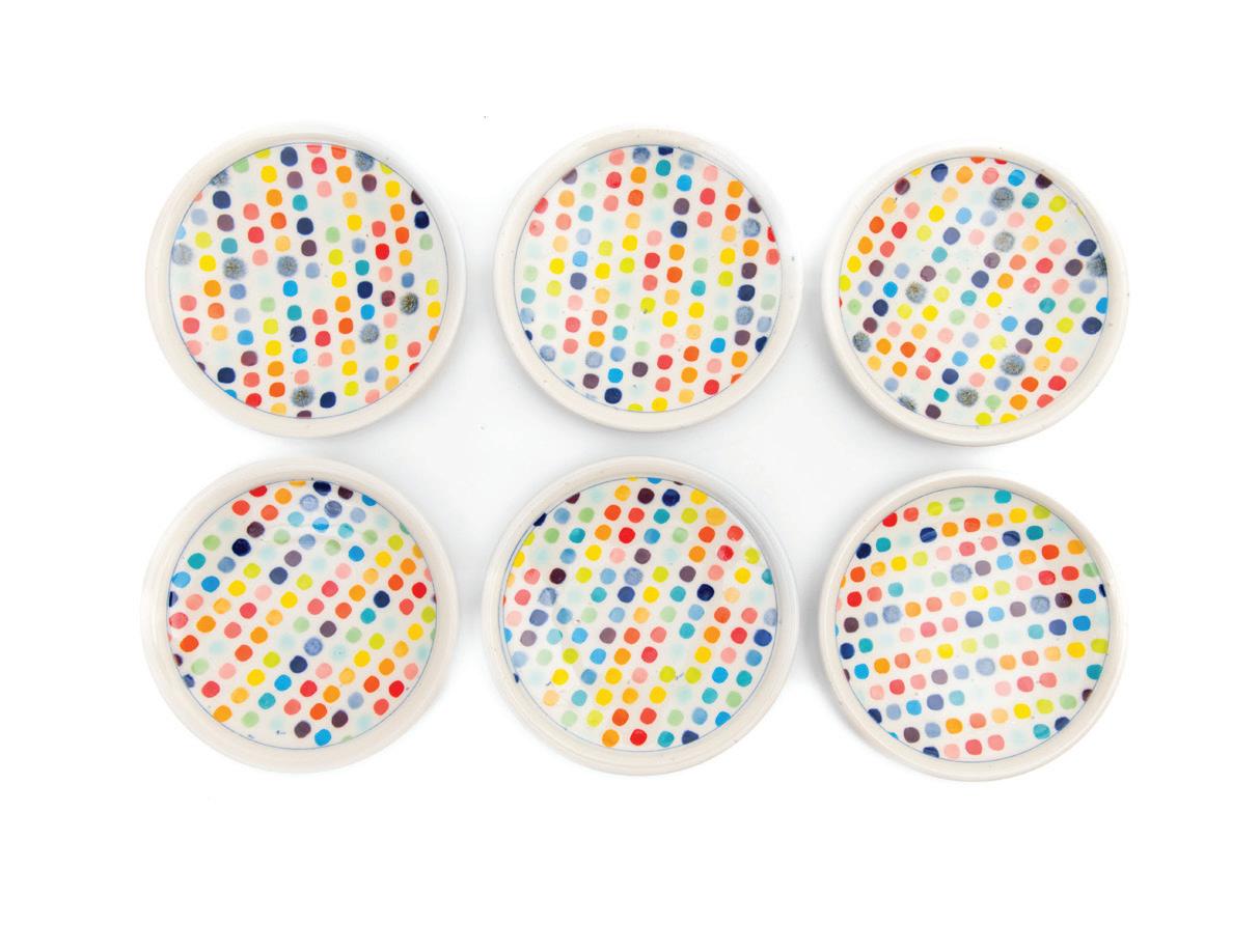 Mid-range stoneware, white slip, underglaze, and clear glaze