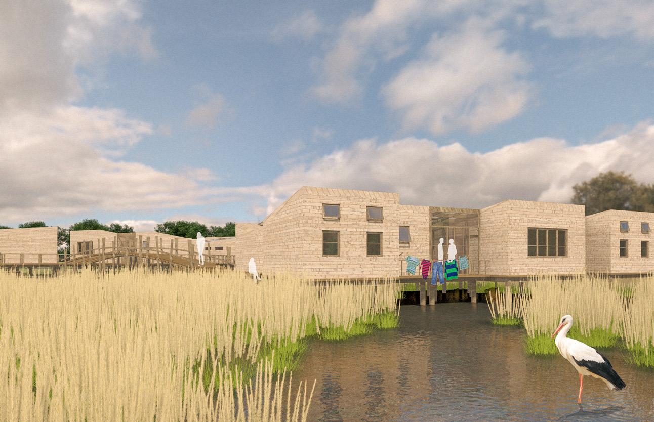 The project envisions a self-sufficient eco-village in Empordà’s protected wetlands, integrating a net-zero waste system that utilizes natural resources and human by-products. Curved, elevated pathways minimize ecological impact while enhancing the user experience.