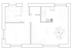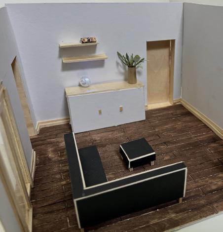 To properly observe the space I created, I made a quick interior model from mountboard and wood to be able to comprehend the use of space. This particular model is displaying the living room and parts of the open floor plan, which would include the dining space near the kitchen. The model highlights the movement of the space created and captures the way a room could be inhabited successfully.