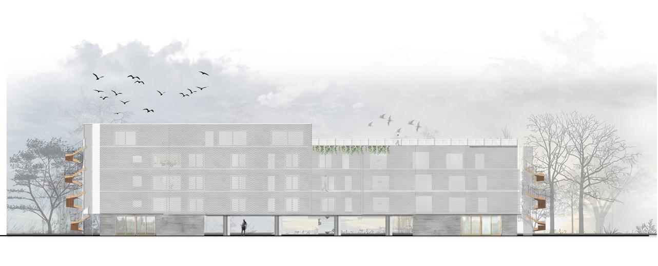 For our second year project, the site was in tolworth, a suburban area which is also a carpark. The overall aim was to create a housing scheme including one, two and three bedrooms, alongisde a factory. The objective was to also ensure there was some cohesion inbetween the factory, housing and surrounding site. Additionally, it was emphasised that our buildings must comply with passivhaus standards and be sustainable. With all these requirements from the brief considered, the result is displayed in fig 28 and 29. I utilised solar panles on both the factory and housing schemes, which created some unison amongst the two buildings whilst also opting for CLT to be the primary structure of them both. The scheme became nicely completed, moulding well within the sites landscape and surrounding buildings.