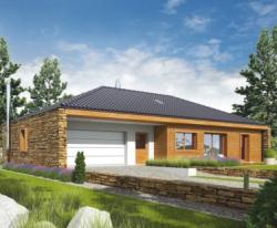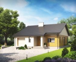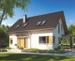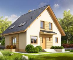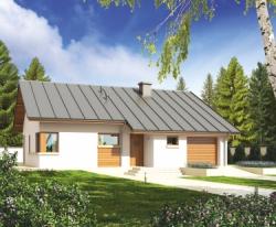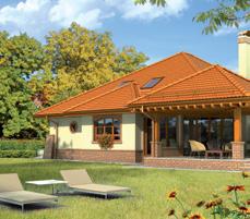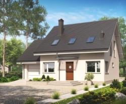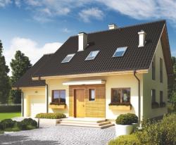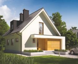 Charakterystyka: dom parterowy z poddaszem u¿ytkowym, niepodpiwniczony, z gara¿em jednostanowiskowym. Przeznaczenie: dom dla 4-5-osobowej rodziny Uk³ad funkcjonalny: strefa dzienna parter: salon z kominkiem, kuchnia oraz jadalnia dodatkowo na parterze: komfortowa sypialnia, ³azienka, garderoba, kot³ownia dostêpna z wiatro³apu i kuchni oraz gara¿ strefa nocna  poddasze: dwie du¿e sypialnie, komfortowa ³azienka dodatkowo na poddaszu: gabinet, pralnia