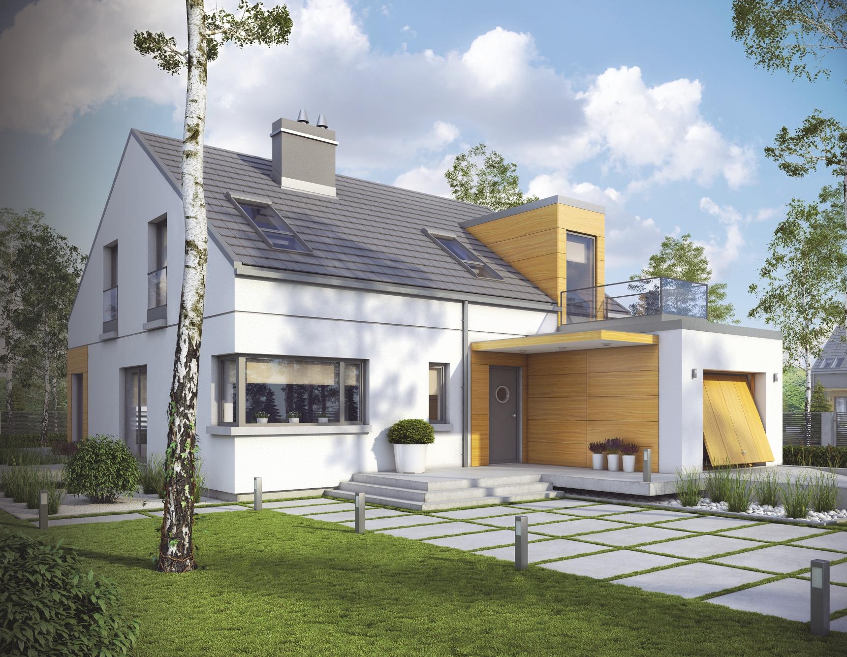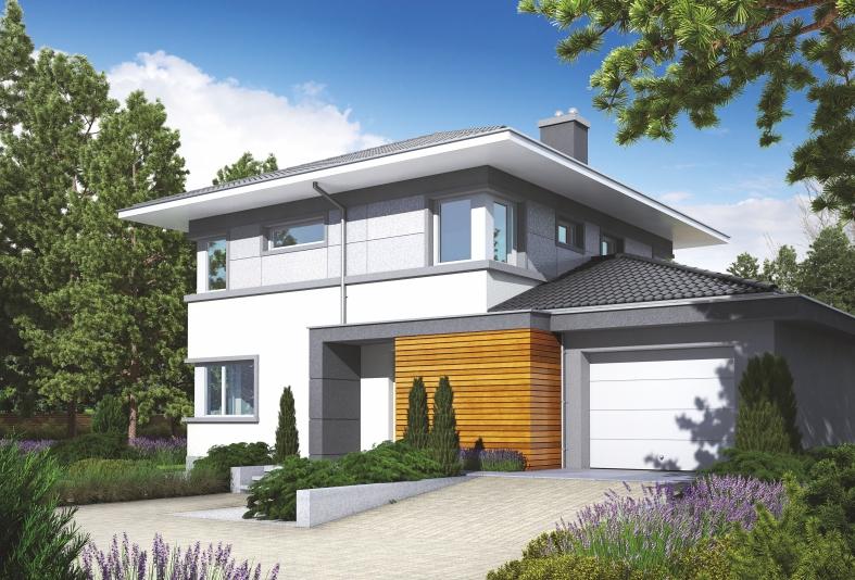 Opis: Edgar G1 ENERGO to nowoczesny dom, który ³¹czy atrakcyjny design z trosk¹ o najwy¿szy komfort u¿ytkowy Prost¹ bry³ê domu, wzbogacono ciekaw¹ form¹ gara¿u, nad którym zaplanowano taras, dostêpny z wykusza. Dla estetycznego smaku, ascetyczn¹ biel elewacji prze³amano naturalnym odcieniem drewna Projektuj¹c taras, wykorzystano surow¹ urodê betonu. Dziêki zastosowaniu du¿ej iloci przeszkleñ, we wnêtrzu króluje przytulna wygoda Dom spe³ni oczekiwania inwestorów, którzy ceni¹ oryginaln¹ architekturê i sprawdzone rozwi¹zania funkcjonalne