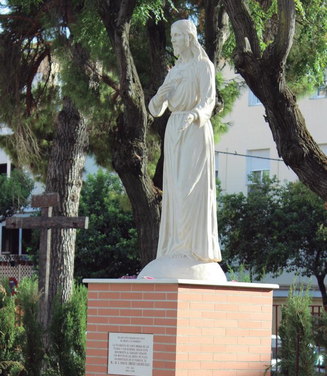 presa serenidad, afecto y confianza, quedando enmarcado entre la larga cabellera y la barba. Tiene la cabeza ligeramente inclinada hacia adelante, expresando la cercanía del Señor. En el pedestal, leemos en un azulejo: «He aquí este Corazón que tanto ha amado a los hombres. La feligresía de Santa María de las Flores y San Eugenio, erigió este monumento al Sagrado Corazón con motivo de las Bodas de Plata sacerdotales de su párroco, el M. I. Sr. D. Ignacio Jiménez Sánchez-Dalp. 1999-2024. AMDG et BVM».
