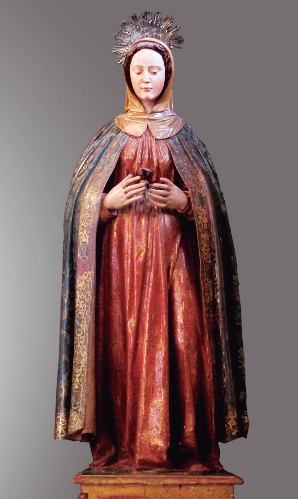 Santa Mónica de la iglesia de San Agustín, que muestra a la Madre de Dios con acusada frontalidad y hieratismo, de pie, con la mirada baja y con las manos en actitud orante sobre su vientre, el cual se muestra con un ligero abultamiento, que nos indica el estado de gravidez de la Virgen. Viste túnica roja, color de la sangre que simboliza por ello su humanidad, re-