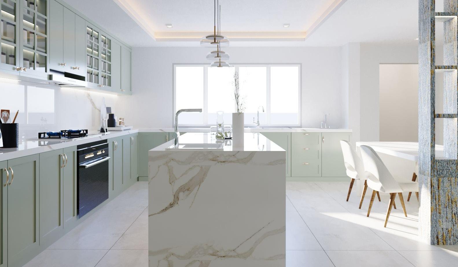 The juxtaposition of matte lacquer Tea Green finish for the island’s doors against the backdrop of Arctic White units creates a captivating contrast, infusing the kitchen with a sense of modern elegance. This interplay of colors lends a dynamic focal point while maintaining a cohesive aesthetic. The choice of White Calacatta silk finish countertops further enhances the space, imparting a minimalist yet luxurious vibe. Together, these elements harmonize to craft a kitchen that exudes sophistication and purity, with clean lines and a contemporary allure.