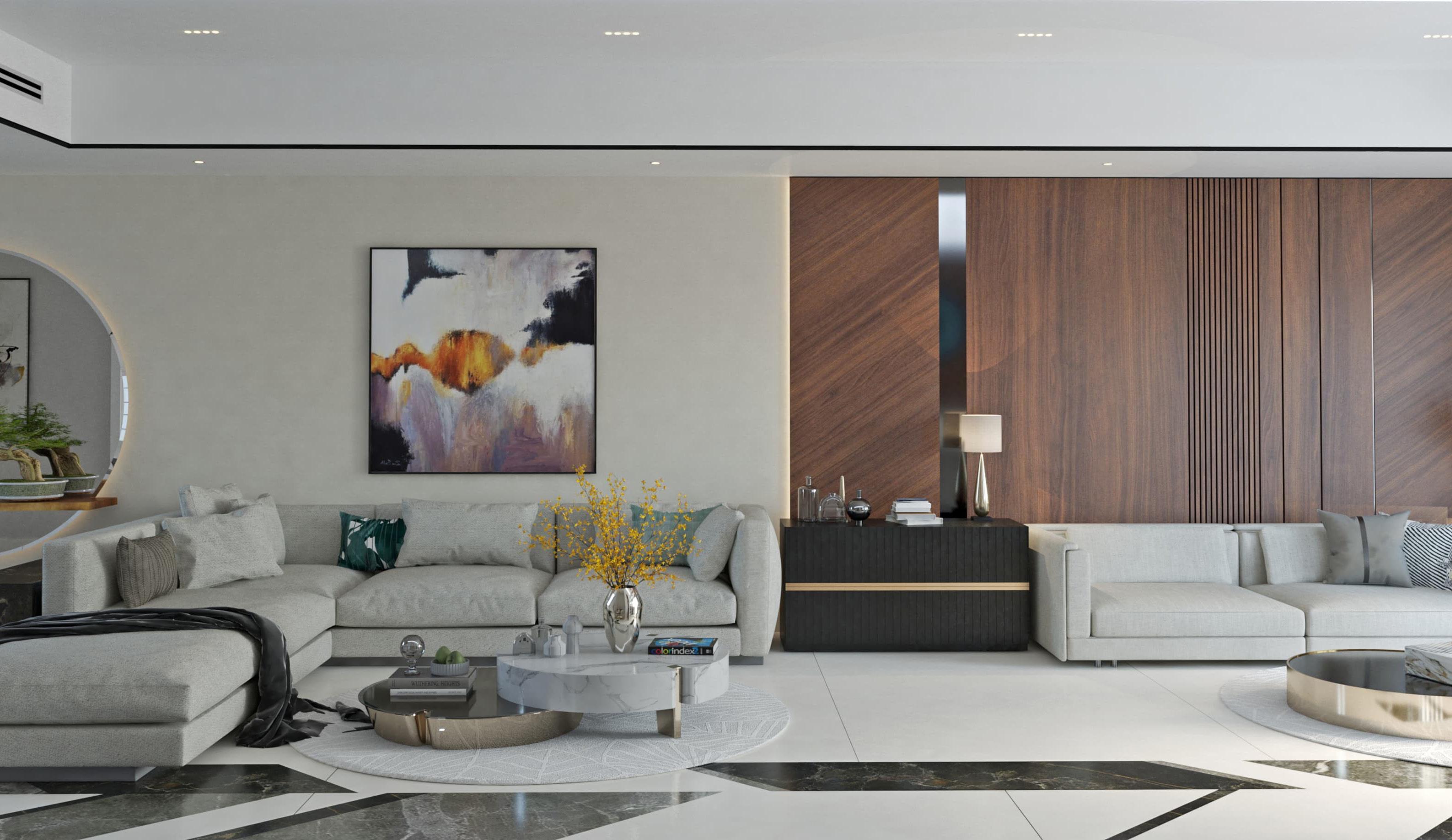 creating a welcoming and visually appealing living hall that exudes timeless elegance. Enhance the ambiance with strategically placed lighting to highlight the texture and grain of the veneer.creating the wall panel to be focal point of the living room with the help of monochromatic theme of furniture and colors