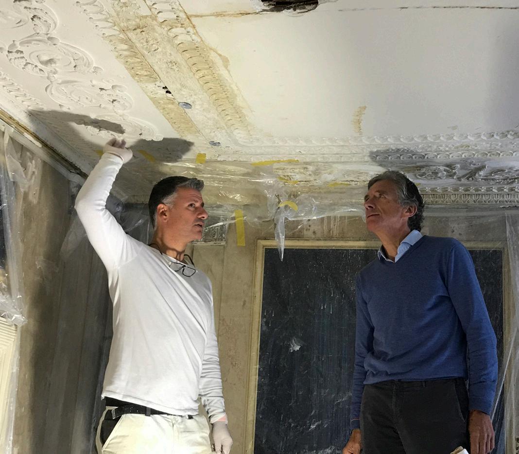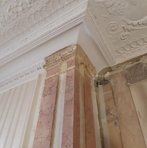 08/2019 start restauratie stucadoor Zardoni (entresol) start restoration of scagliola by Zardoni (Mezzanine)