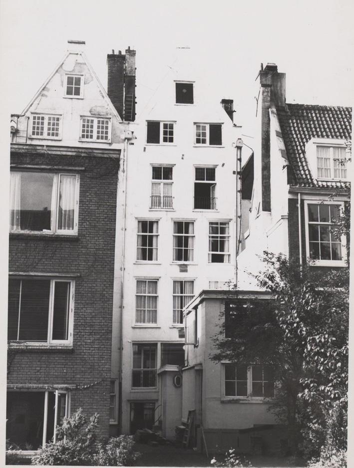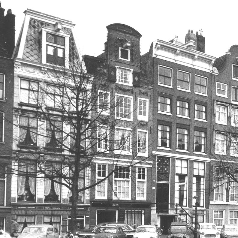 The four houses originally had a gable with wing pieces, a segmental pediment, two ribbons with “Ao” and “1672” and garlands around the loft window and on the parapets. The garlands and the year ribbons have disappeared. As the left outer building, Keizersgracht had a sidewalk on the left.