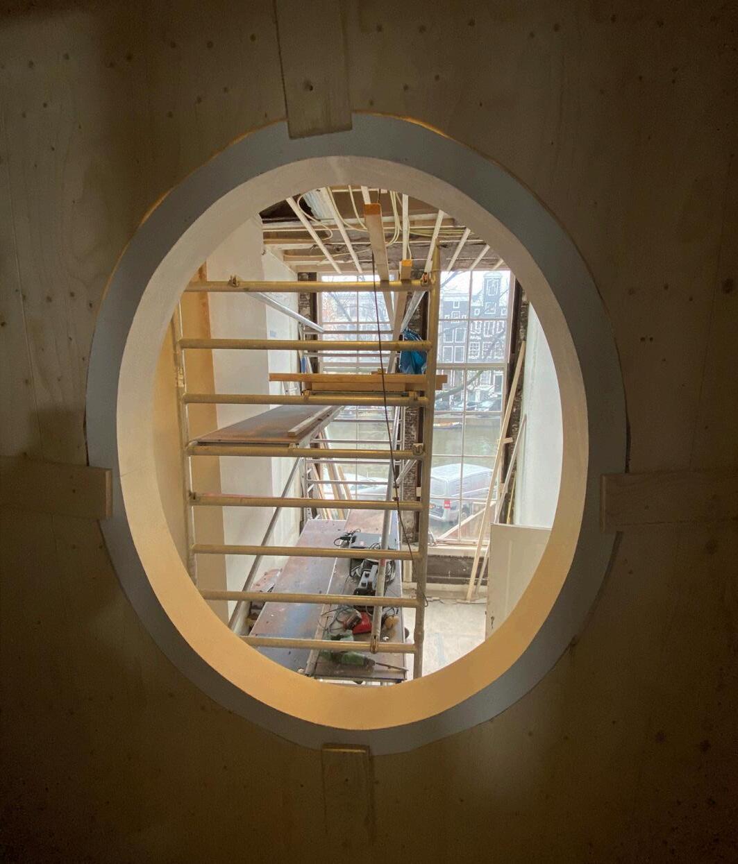 Architectural firm Vroom received the order for the restoration of the building at Keizersgracht in August 2017. In the following months, the preliminary design was adopted and completed in March 2018. The building permit was submitted on May 2 and granted on August 1 by the Municipality of Amsterdam. The construction work contract was signed at the end of October with the main contractor Leguit and Roos. They immediately started the demolition work. The construction work took one and a half years, until March 2020. Plasterers and Restoration company Zardoni has been hired to restore the scagliola room. They started in August 2019. The entire building was completed in July 2020.