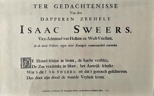 1673: PoeminmemoryofthebraveseaheroIsaacSweers,Vice-AdmiralofHollandandWest-Friesland,whodiedingloryinthethird Victory against two Kings.