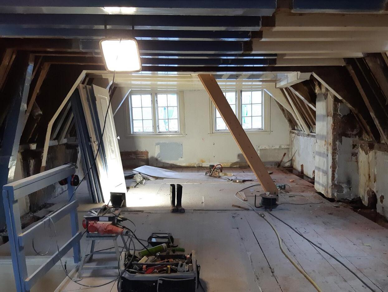 Het pand verkeerde bij aanvang bouwtechnisch in redelijke staat. De fundering was immers al hersteld en de algemene staat van het casco was in orde, maar de gevels, daken en de gevelkozijnen waren aan onderhoud toe.