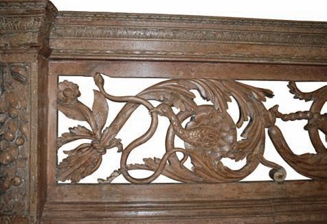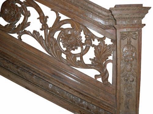 Pierced balustrades were first used in the early 17th century, when designs were generally geometric. Elaborate carving seems to have introduced around the 1630s, an example of which can be seen at Ham House, embellished with military trophies and cannon, with the newel posts supporting baskets of fruit and flowers. Similar finials, although usually with urns rather than baskets, became popular for the grandest staircases in the period from around 1650 to 1690. The Crakemarsh Hall Stair had such finials, now sadly lost, with the newel posts having carved panels incorporating a drop of fruit and foliage suspended from a bow. The carving in the balustrades takes the form of scrolls of acanthus foliage around central flowers, possibly sunflowers; snakes and a peacock are in evidence with more acanthus leaf carving to the handrail string. It is worth noting that the main stair at Tredegar House has recently been dated by dendrochronology, giving felling dates from 1666