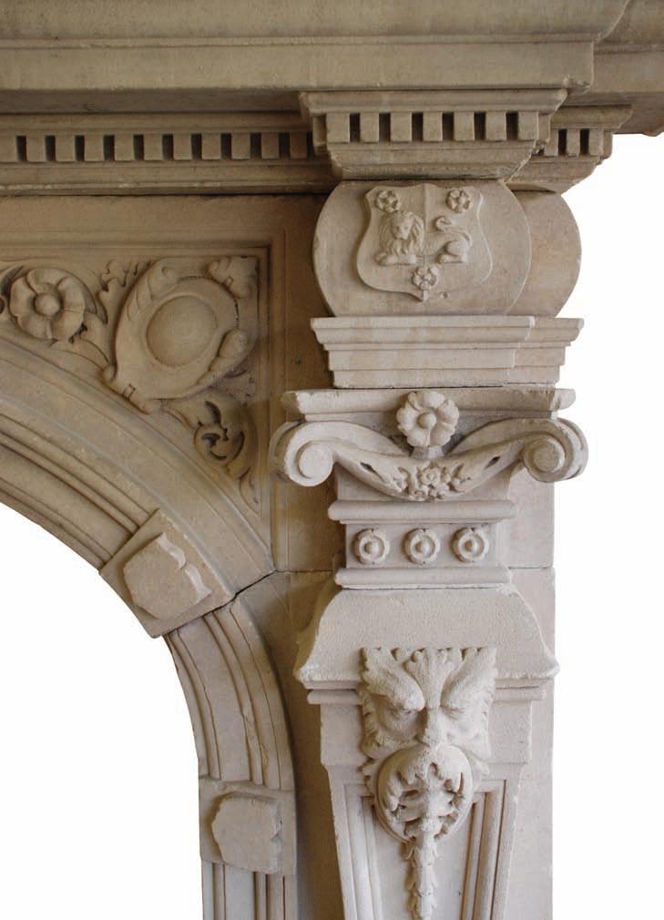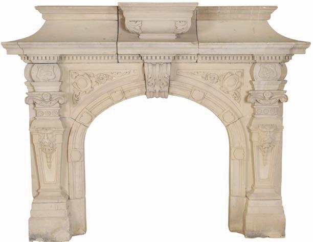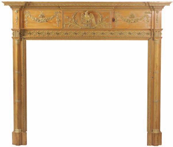 A George III, circa 1800, pine and composite fire surround; the central tablet having phoenix, reed and thistle decoration flanked by swags of grape and vine, and the jambs having unusual tripartite cluster columns. Additional embellishments include boars’ heads, egg and dart, and acorn motifs. Provenance: removed in the early 1980s from a property on Forth Street, Edinburgh, Scotland. Style and date would relate to buildings designed on this street by Robert Burn.