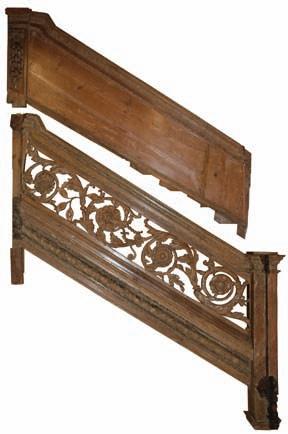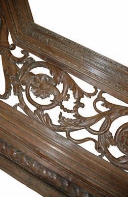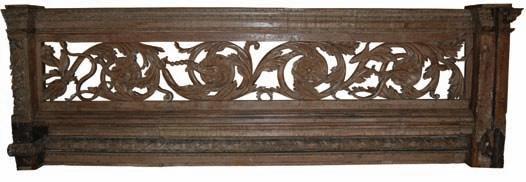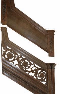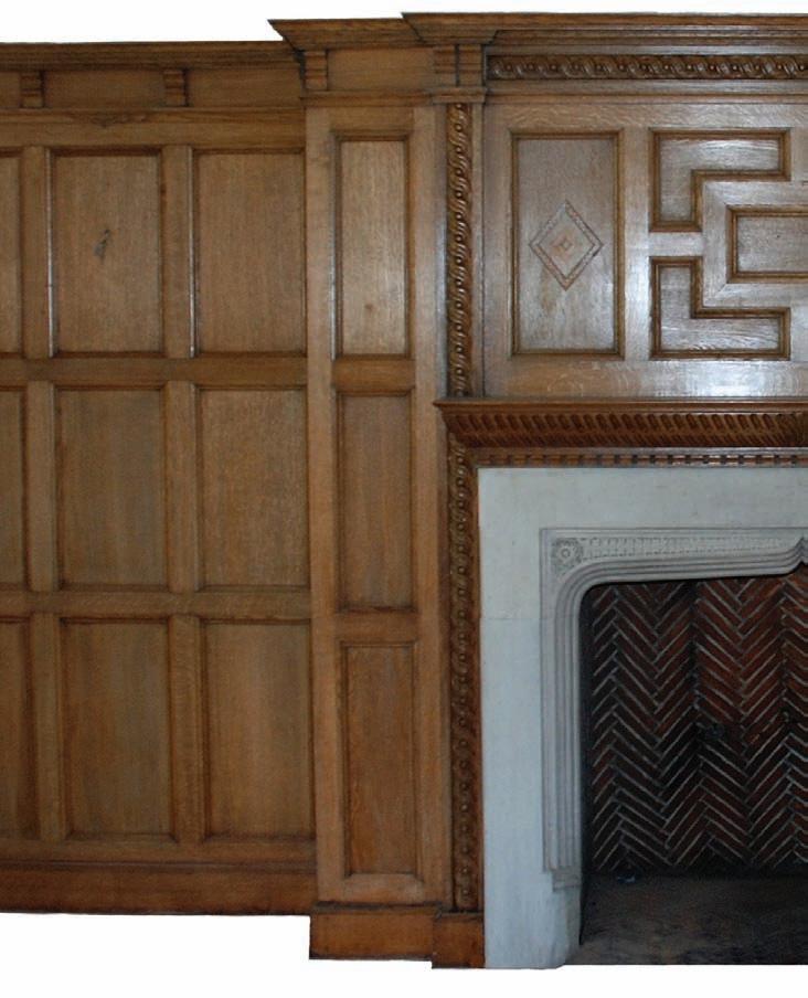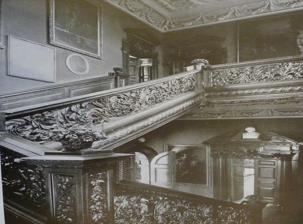 A mid to late 17th century carved oak staircase with accompanying pine panelling; this stair was rescued prior to Crakemarsh Hall’s demolition. Nikolaus Pevsner in the 1950s described Crakemarsh Hall as a ‘compact two story stucco villa circa 1820, …all very quiet and modest; and a surprise to find that the house seems to have been built (or possibly re-built) around a sumptuous 17th century staircase’. The staircase, which occupied the whole of the entrance hall, has lavish open panels of acanthus foliage set between large square newels decorated with fruit. The stair, now without runners and risers, consists of three extravagantly carved oak rising rails and a single return gallery carved in the manner of Edward Pearce (circa 1630–1698). Though the sales particulars for the Hall and estate in 1968 list the stair as ‘almost certainly the work of Grinling Gibbons’ Pevsner suggests that the Crakemarsh Stair is a copy of the ‘Great Stair at Sudbury Hall by Edward Pearce’, illustrated opposite.