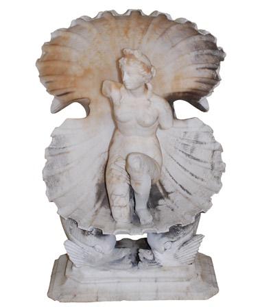 A rare and unusual alabaster Venus emerging from a clam shell, raised and supported by a pair of dolphins upon a square base with chamfered corners. Circa