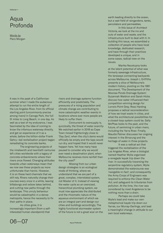 earth leading directly to the ocean, but a vast field of raingardens, tanks, percolators and permeables. In this issue of Architect Victoria, we look at the ins and outs of water and waste, and the infrastructure built to deal with it. In building this issue, we assembled a collection of people who have local knowledge, dedicated research, and have through their practices developed a unique, and in some cases, radical view on the issues. Marika Neustupny looks at the latent potential of what was formerly sewerage infrastructure, the laneways connecting backyards across Melbourne. Joseph L Griffiths presents a slice of Melbourne’s modern history, pivoting on the 1981 document, ‘The Development of the Moonee Ponds Drainage System’. Suzannah Waldron and Sarah Hicks discuss how water influenced their competition-winning design for Lorne’s Point Grey. Ross Harding proposes a radical reconsideration of how we treat waste in cities, and what the architectural possibilities for a closed-loop system could be. Sally McPhee looks to the past, and the future, of swimming in urban rivers, including the Yarra River. Finally, Maudie Palmer discusses her ongoing interest in the Birrarung and the heritage of water in three projects. It was a radical act that triggered the revitalisation of the Los Angeles River, when a biologist named Heather Wylie organised a renegade kayak trip down the river. In successfully traversing the serpentine regulatory system, Wylie demonstrated the watercourse was ‘navigable-in-fact’, and consequently the Army Corps of Engineers was required to enforce the Clean Water Act, and safeguard its tributaries from pollution. At the time, the river was considered by most Angelenos to be nothing more than a drain. Perhaps we could take Wylie’s lead and make our own metaphorical kayak trip down our Yarras, our Murray-Darlings, and lead a meaningful change in attitude to our own local waterways.