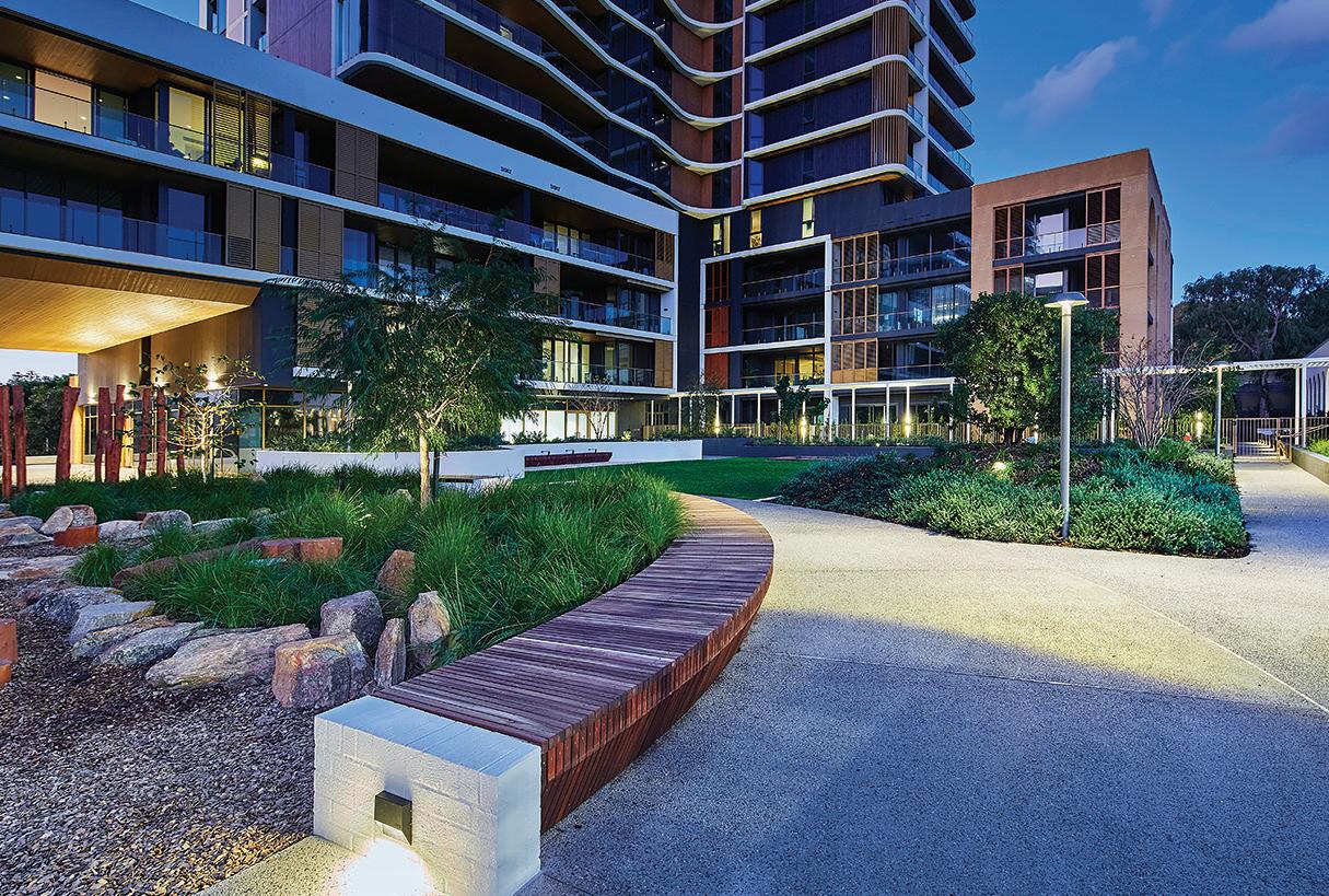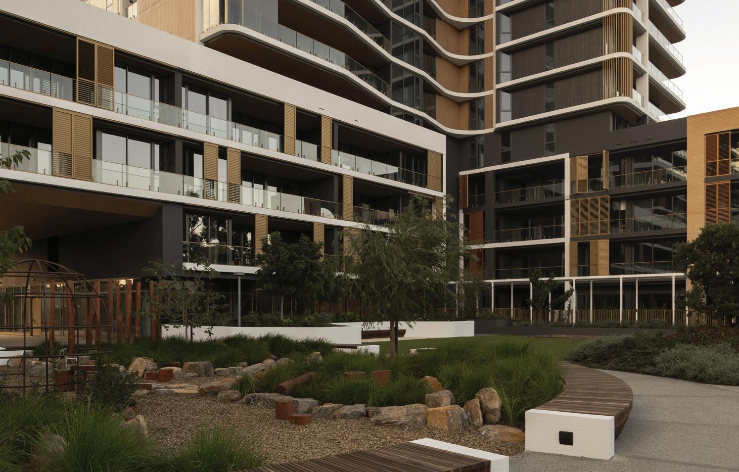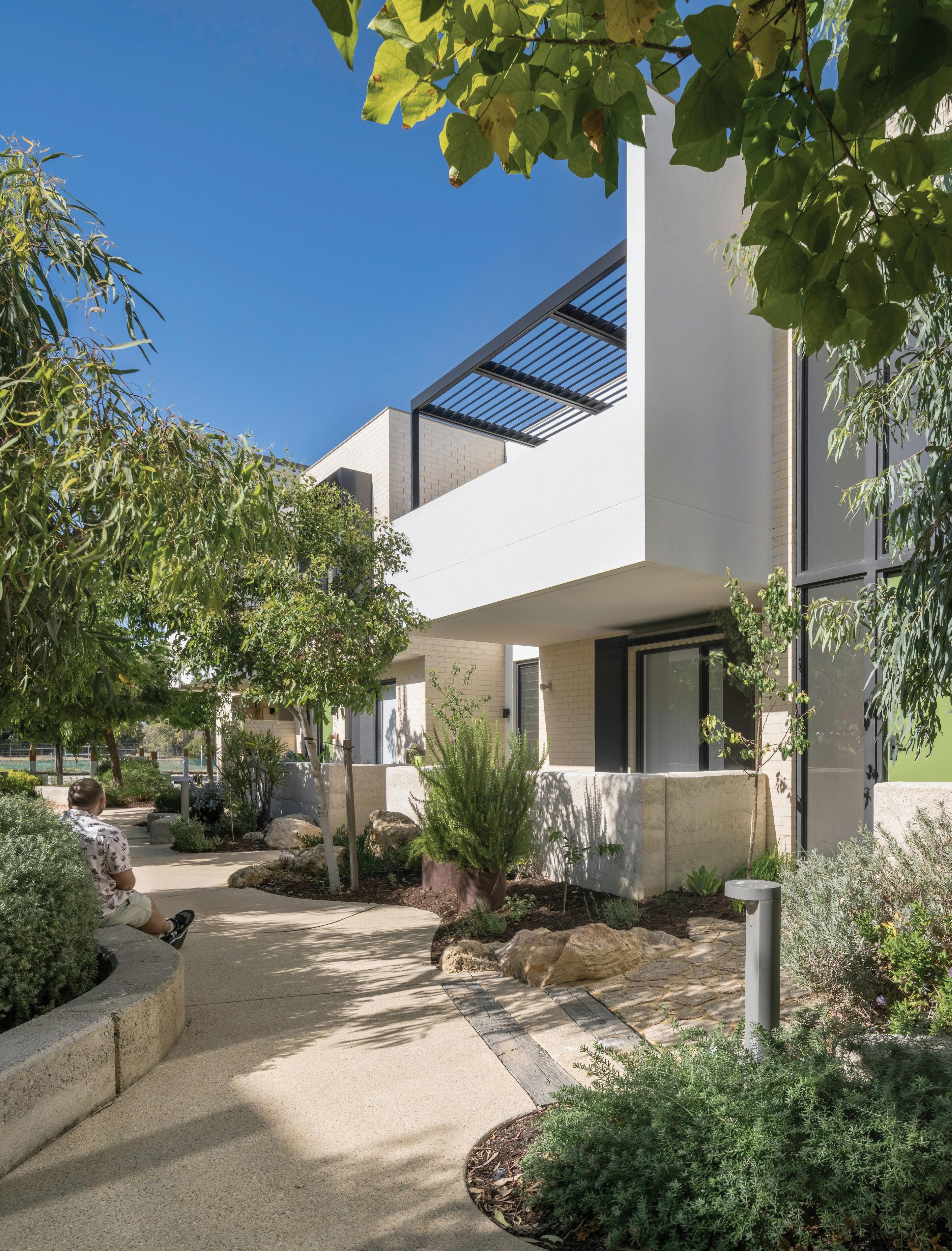 The Grove residences on the border of Claremont, Cottesloe and Peppermint Grove was one of the few major consolidated sites in the neighbourhood that had ability to absorb the density required to alleviate the pressure of rezoning from local heritage streets and their significant mature trees. A needs analysis for a radius of 500m around the site identified a lack of public space and so the decision was made to open up 38% of the site to public access. This new public space incorporates a streetfront amphitheatre ,children’s playground, bocce court, and substantial gardens which provide access to services such as a delicatessen, restaurant, homecare and gym.