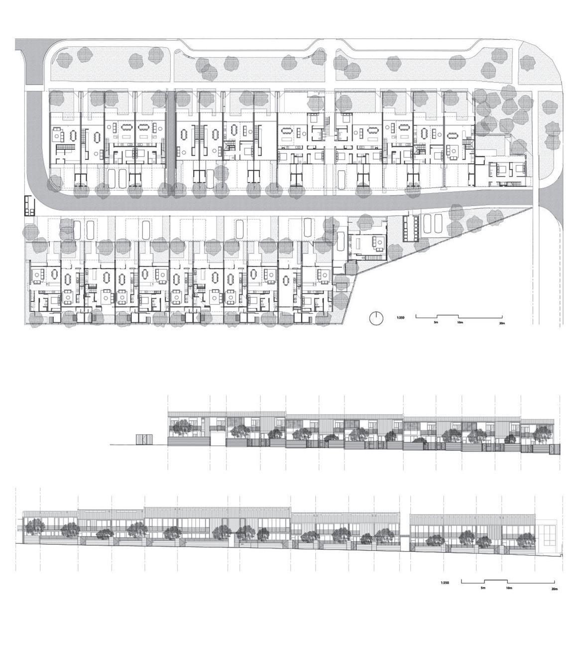 Importantly, parking is pushed to the perimeter of the site. This eliminates tracts of hard surface within the site and dramatically reduces heat sink effect around the houses.