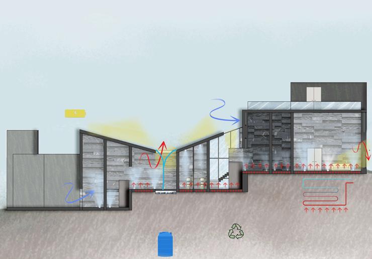 Slate Loadbearing Walls Sheep Wool Insulation Limecrete Floor Slab Concrete Strip Foundation 6122ARC - Weather Pavilion 1:50 Environmental Section 2 1 3 4 5 13 7 10 8 6 11 9 12 9 9 9 Summer Section 1- Microcrystalline Solar Panel 2- Lithium iron phosphate battery 3- Fresh Air 4- Stale Air 5- Rainwater Harvesting System 6- Composting Toilets 7- Ground Source Heat Pump 8- Artifitial LED Lighting 9- Daylit spaces 10- Purposely Dimed space for light experience 11- GSHP - Mechanism 12- Winter Sunlight 13 - Window Vent Heating & Cooling - This building utilises a ground heat pump system for efficient heating in winter and cooling in summer, contributing to its overall environmental sustainability. Ventilation This building integrates window vents, cross ventilation, and night ventilation into its system, ensuring effective temperature control and maintaining a comfortable environment. Lighting - south-facing windows flood the space with daylight throughout the day, while west-facing windows illuminate the light pavilion. This design prevents constant sunlight exposure in the entire building, regulating thermal mass. Renewable Energy - The building employs microcrystalline solar panels to achieve off-grid energy efficiency. This sustainable energy source powers LED lights and supports minimal energy consumption for the café. Waste & Water This building incorporates rainwater harvesting systems to supply water for composting toilets and the café. Any generated waste is composted, contributing to sustainable practices. STRUCTURAL AXONOMETRIC ENVIRONMENTAL SECTION