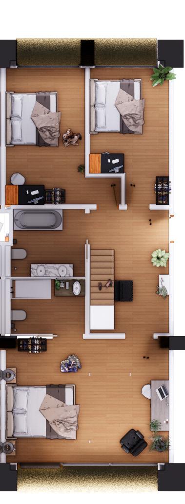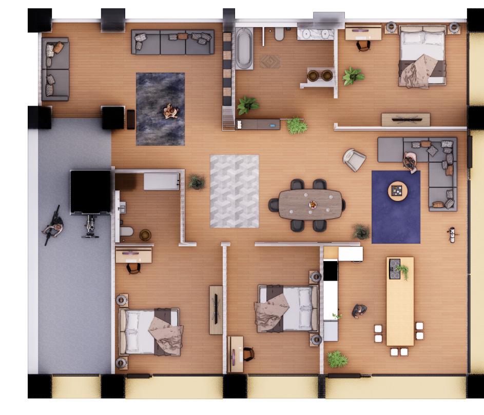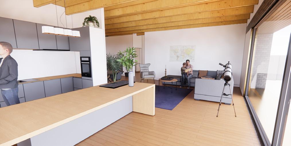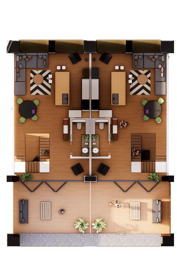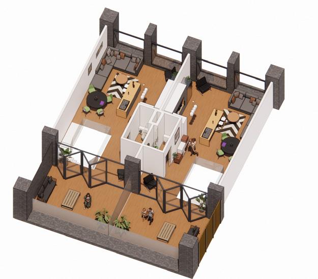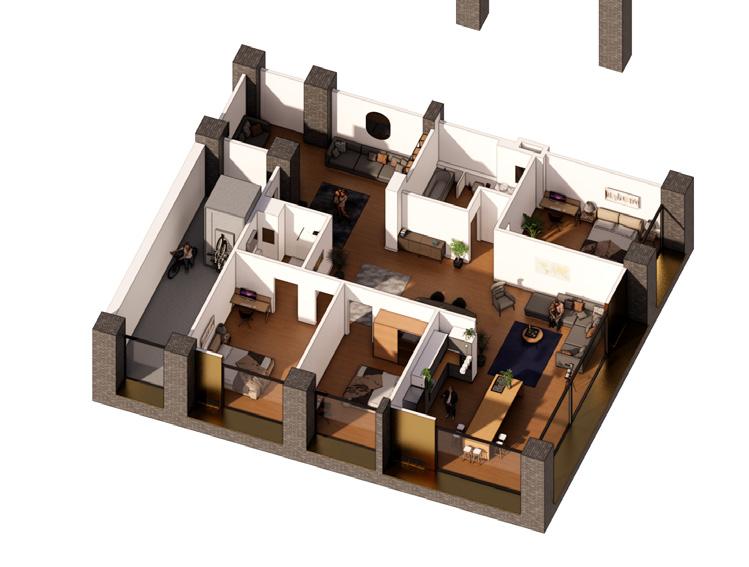 THE LARGER CORNER UNITS MAKE USE OF OPEN PLAN LIVING BY DIVIDING THE PLAN INTO SECTIONS FOR LIVING DINING AND LOUNGING. THE UNITS ENCOMPASS THE SAME DESIGN PHILOSOPHY AS THE OTHER UNITS IN THE DEVELOPMENT. THE STAIR CORE IS USED TO ACCESS THE APARTMENT AND CAN BE USED AS A STORAGE AREA FOR RESIDENTS BIKES.