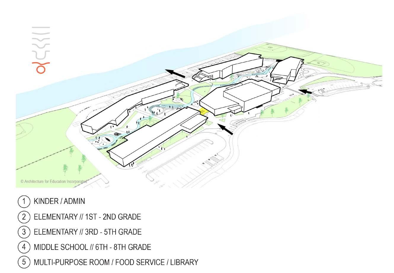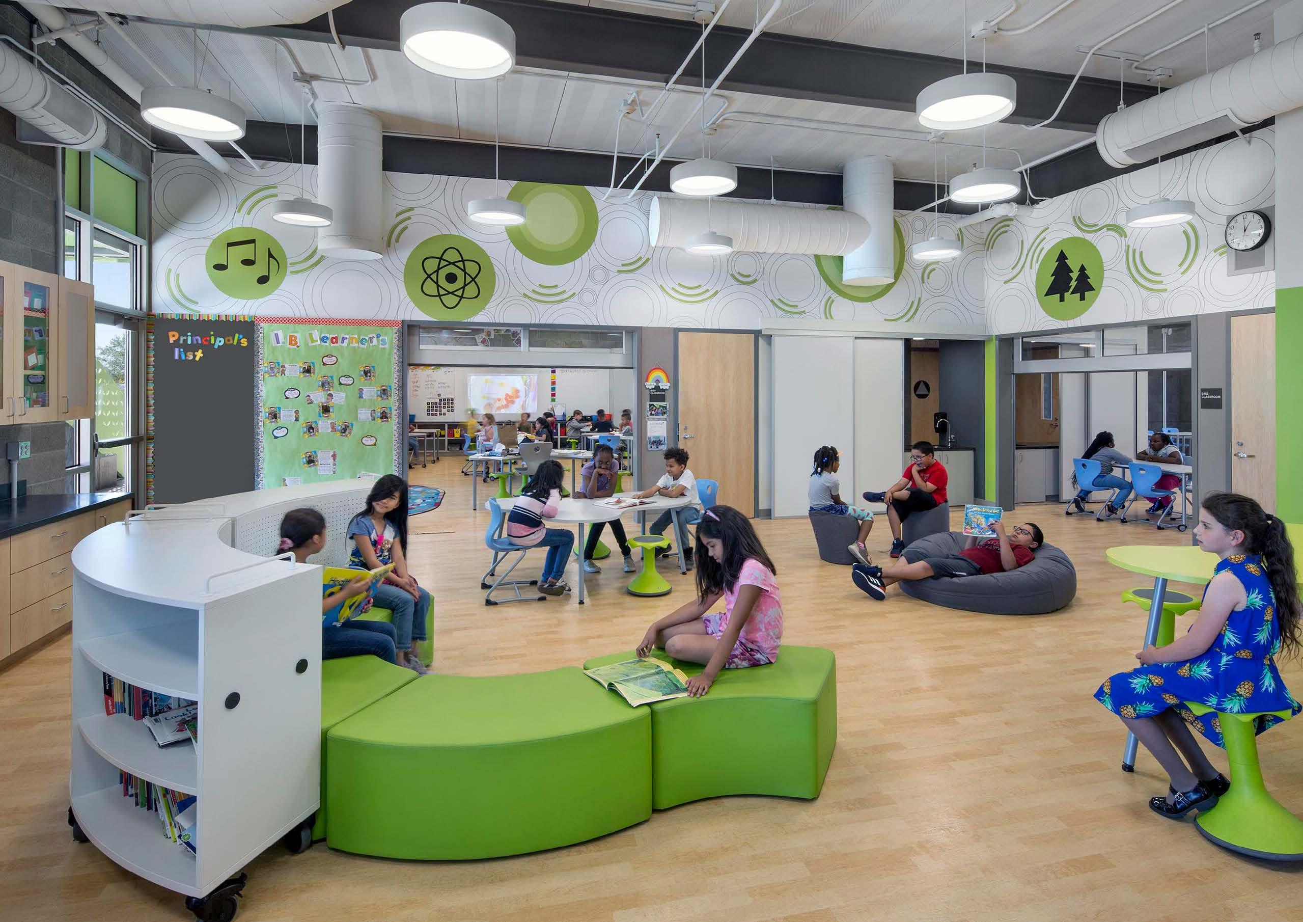 The learning experience is enriched by theme-based work centers clustered around classrooms, with structural elements, materials, and systems thoughtfully integrated into the educational process.
