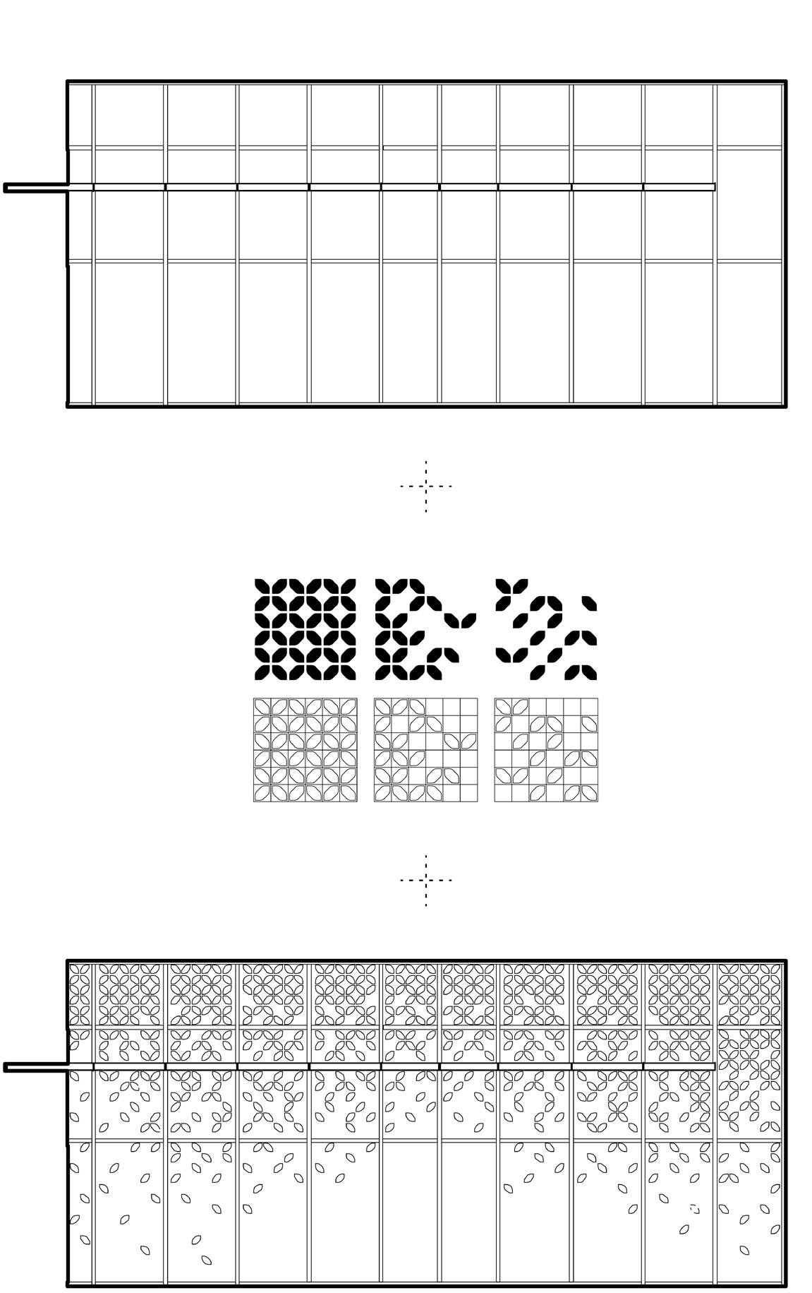 In order to meld the traditional with the modern in a cohesive way, the design incorporates the traditional concept of Nature as Ornament through a “falling leaves” pattern on the modern glass box.