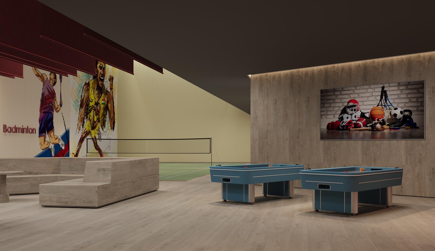 The Sports Zone at Jayabheri Pinnacle's interiors feature double-volume spaces that With professional-grade courts for table serious players. The design prioritizes functionality, modern aesthetic.