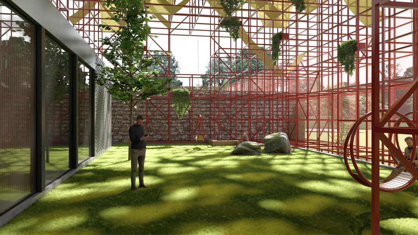 Stepping inside, the interior various activities, all while intricate lattice of red steel Every pathway, every planted where every step is a discovery, balance between functionality