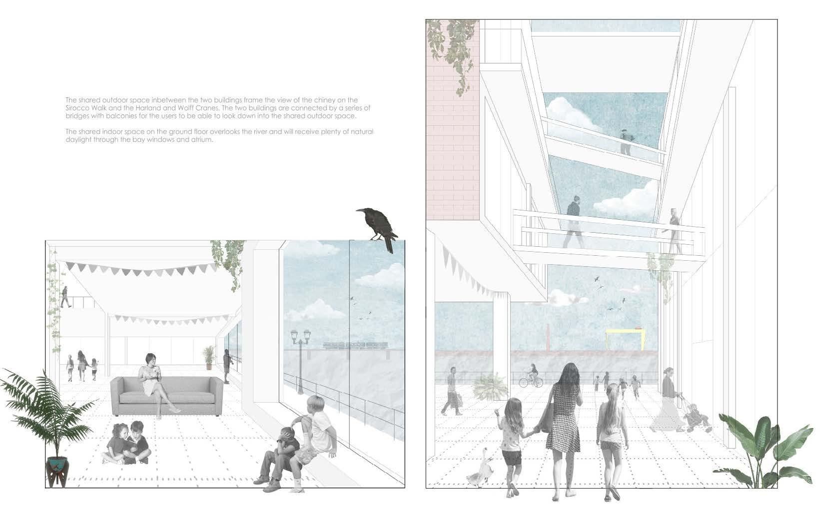 In semester two, both projects saw students working together to produce research driven proposals on how to make the city a more social and sustainable place. The first project, Public CoLab, was a collaborative research laboratory, led by Dr Nuala Flood, that used the power of architectural design research to investigate complex issues of public concern in Belfast. This was a joint one-week project with masters level students.
