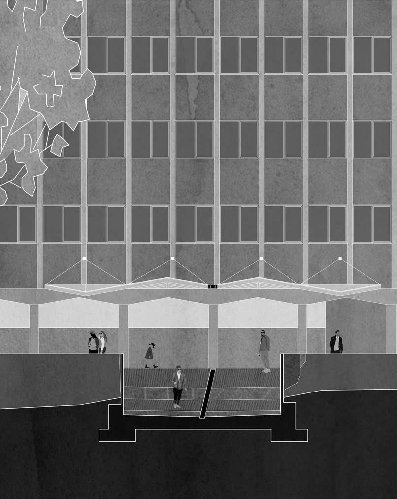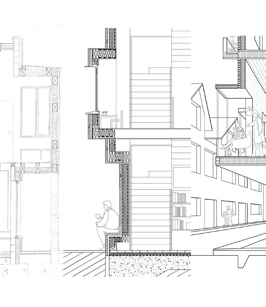 In semester two, the second project, Inhabited Façade, students were asked to make an ‘Inhabited Facade’ to revitalise the public realm on a site in much need of regeneration in Belfast. The group work phase of this project was a shared effort in creating an architectural response to context, using the site analysis produced by larger teams. Students then developed their assigned individual brief within the schemes produced by the collectives. Throughout all phases of the project, students were required to research precedents and develop their designs through physical models and drawing. This assignment allowed students to explore the process of making architecture from the urban scale to the threshold.