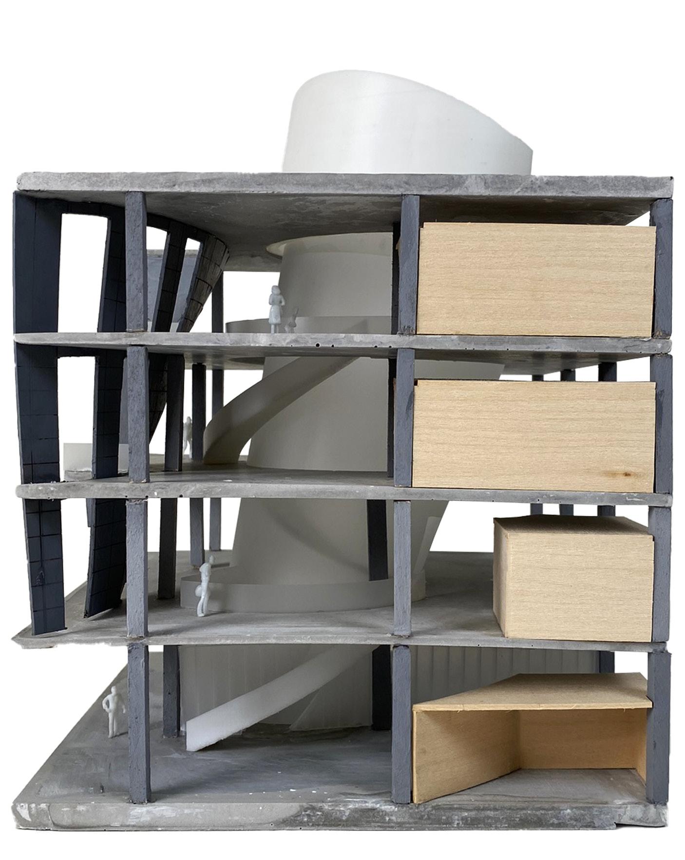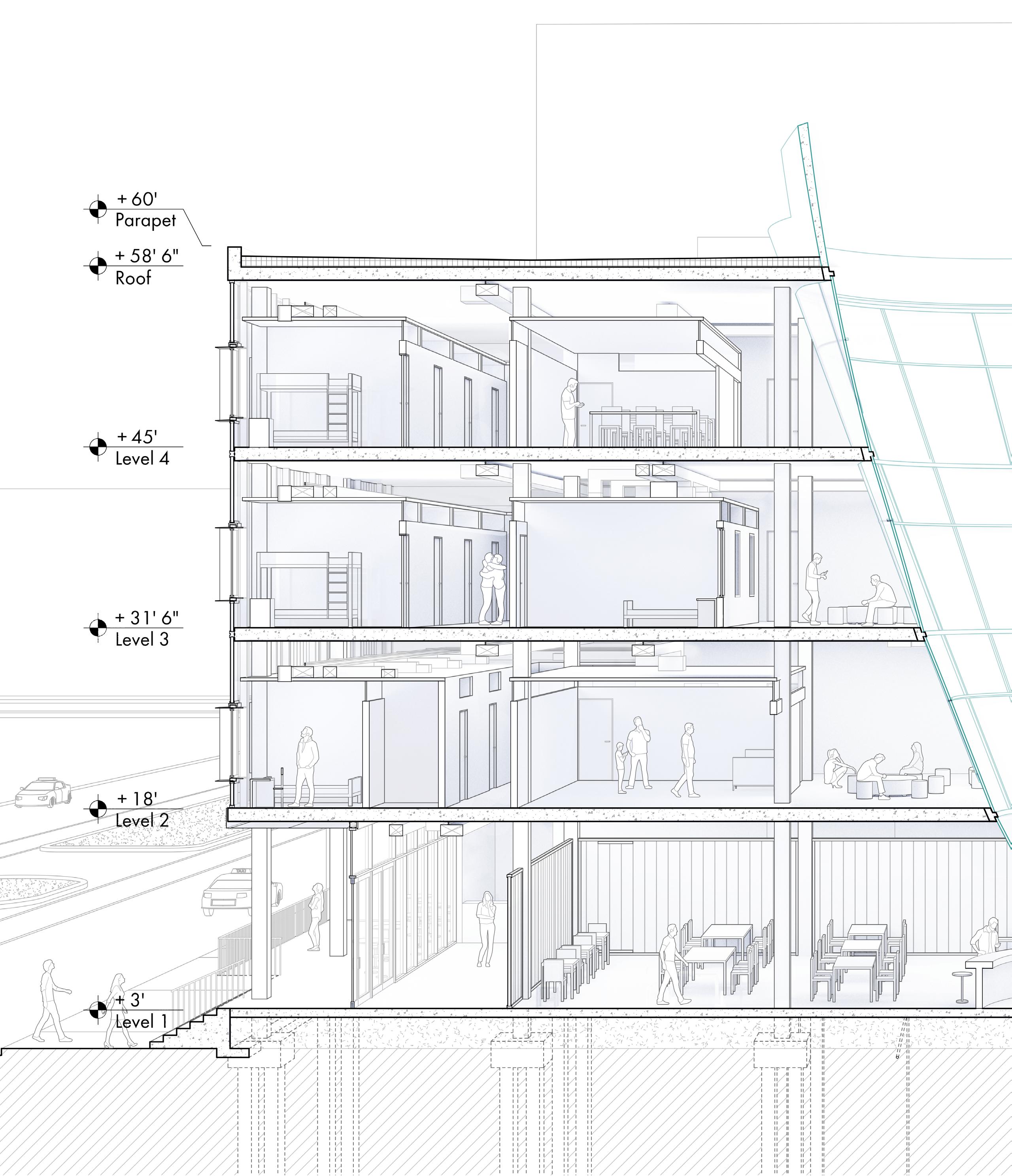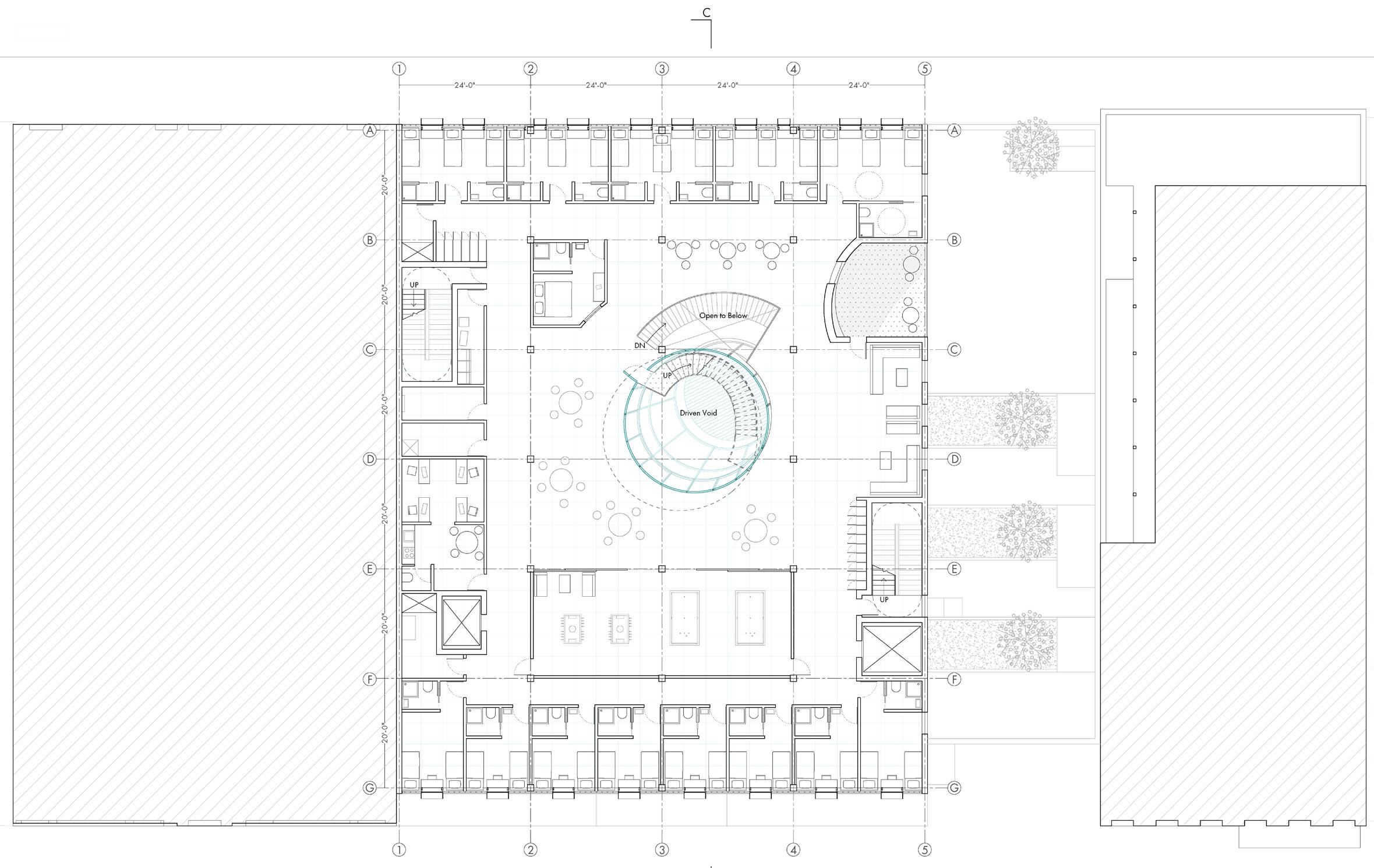 This proposal aims to maximize natural light by inserting a large funnel oriented toward the sun through the center. The idea comes from rarities in the New Orleans grid that create grids inside of grids, which are translated into the concept of a thing within a thing. Elements of the hostel also follow this same general concept, with each room having a disconnected lid that also assists with maximizing natural light. Following through the center of the project is a monumental staircase that weaves through the funnel to the fourth floor. On the project’s North side is a second funnel that voids out a balcony and creates a spatial relationship between the two objects on the interior. Beneath this balcony is a small courtyard with small rain gardens to utilize collected water.