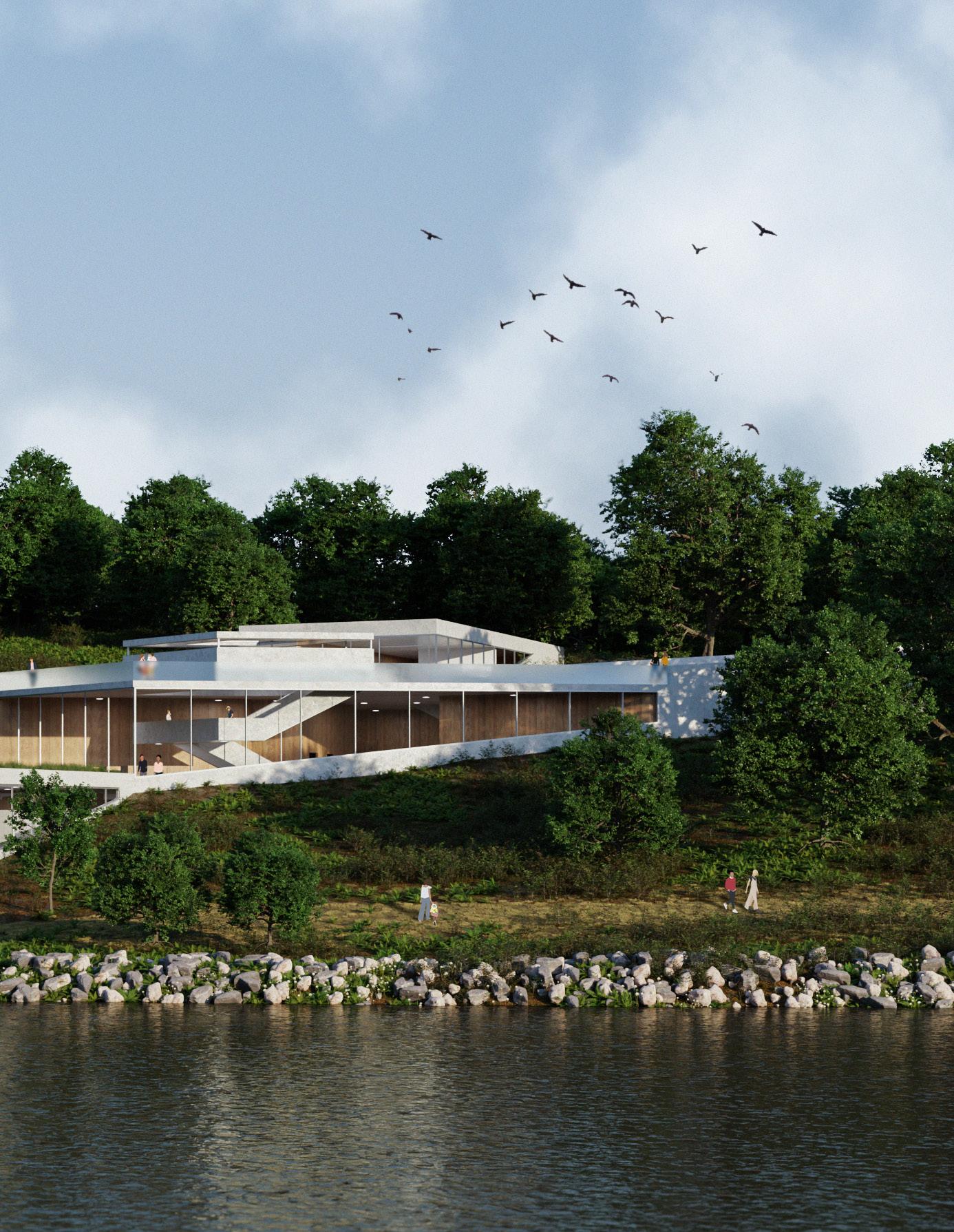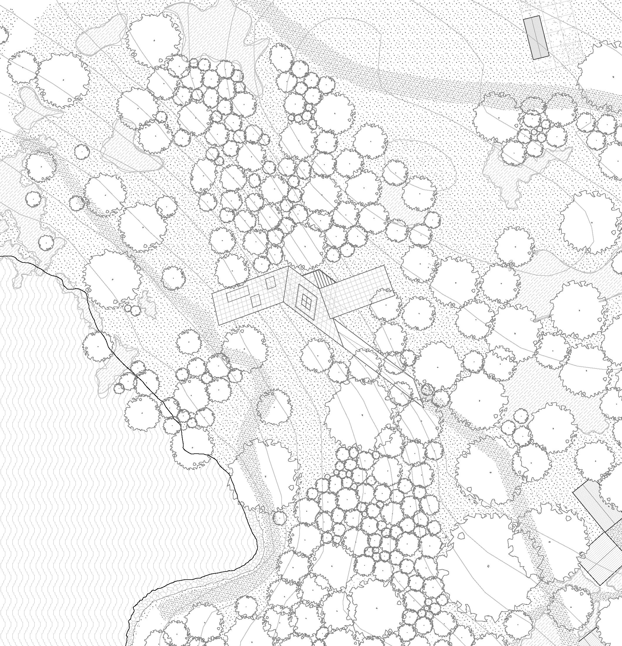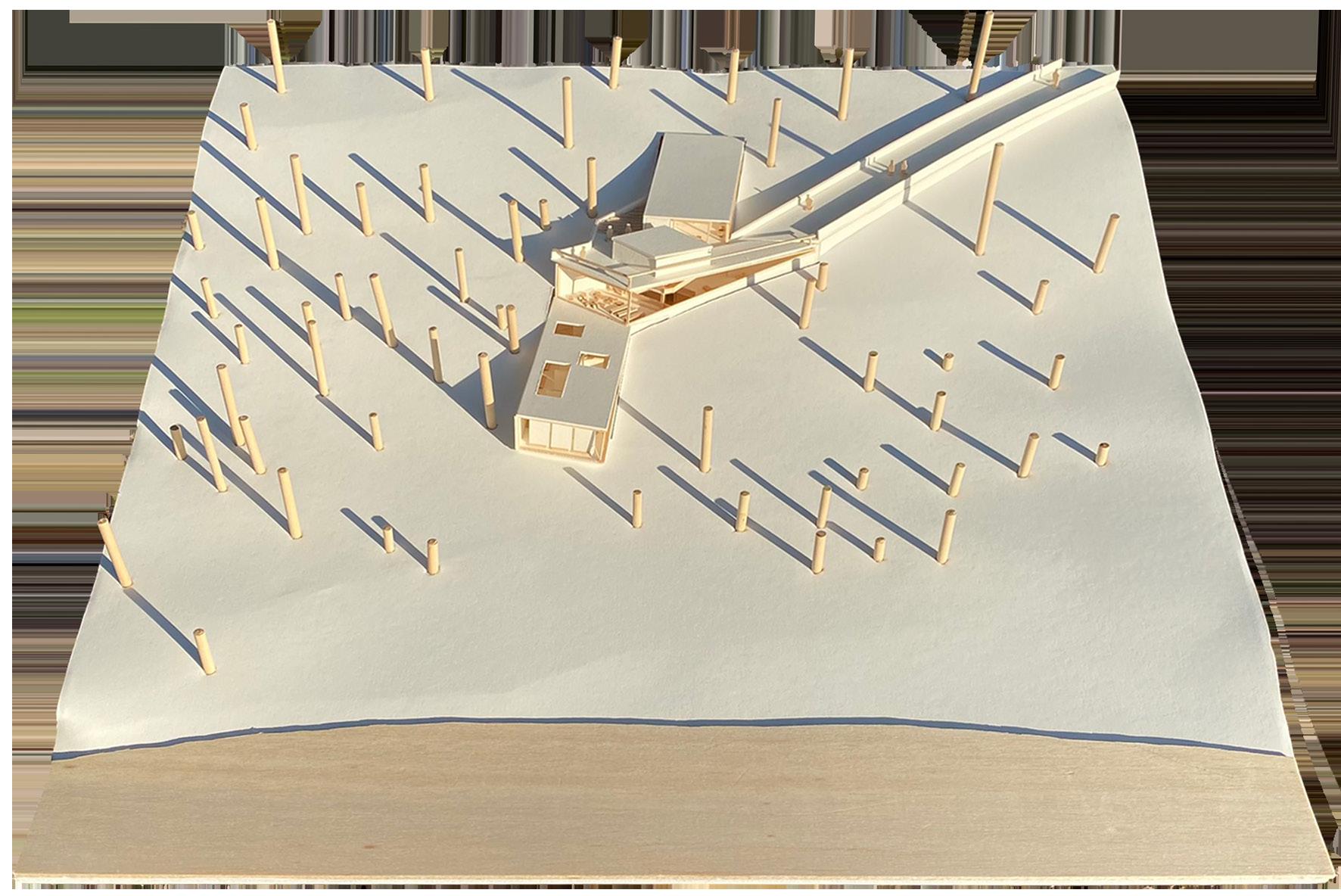 The site is situated above a three-level abandoned salt mine with an extensive history that once defined the area. Overgrown with trees, the owner removed all the invasive species and has left only plants native to the marshlands. The proposal uses the orientations from the three salt mine levels to create a form that avoids the pre-existing trees to protect the site’s vegetation. By embedding itself into the ground, the museum emulates the experience of the original mine and takes advantage of some of the only elevation changes in south Louisiana.