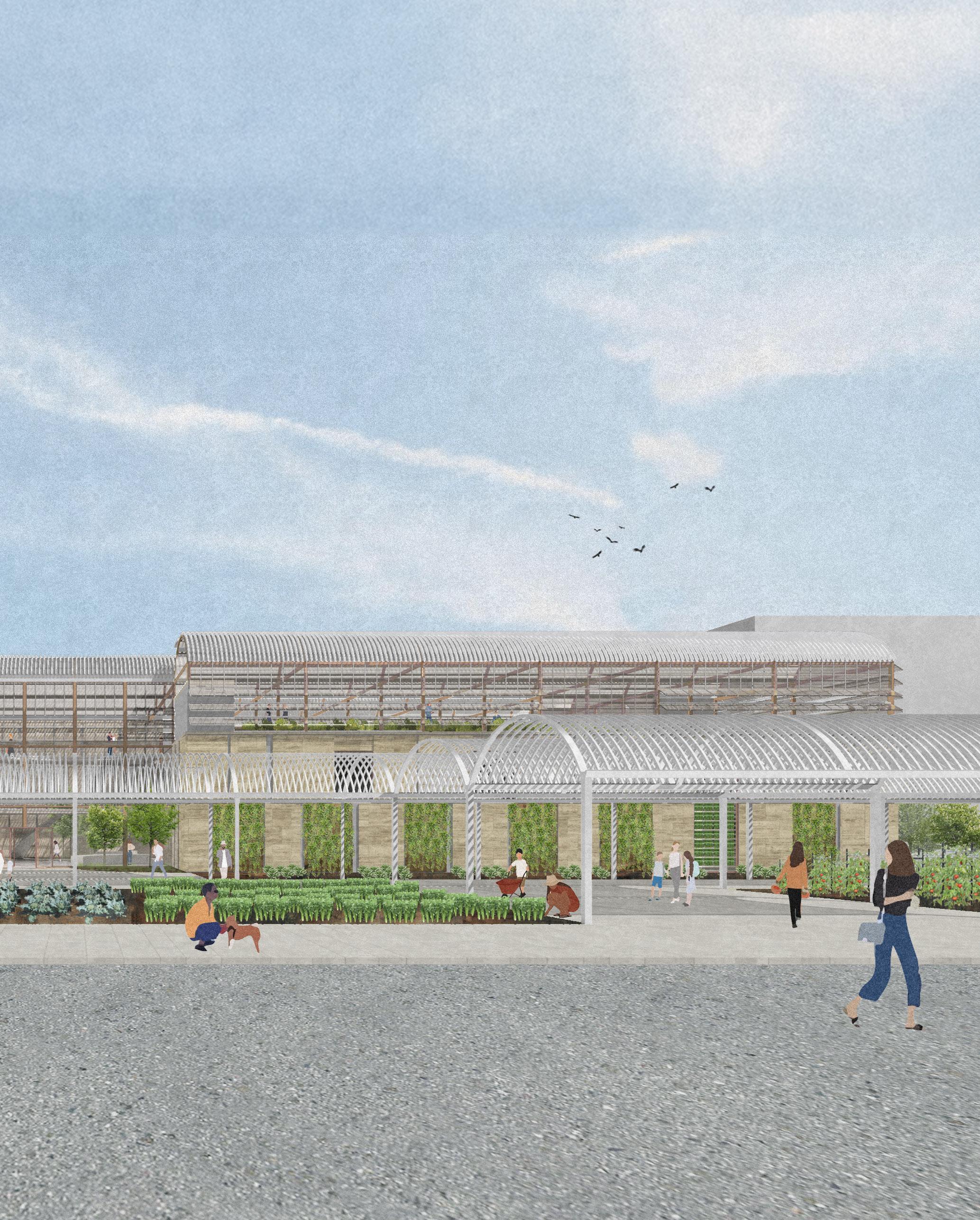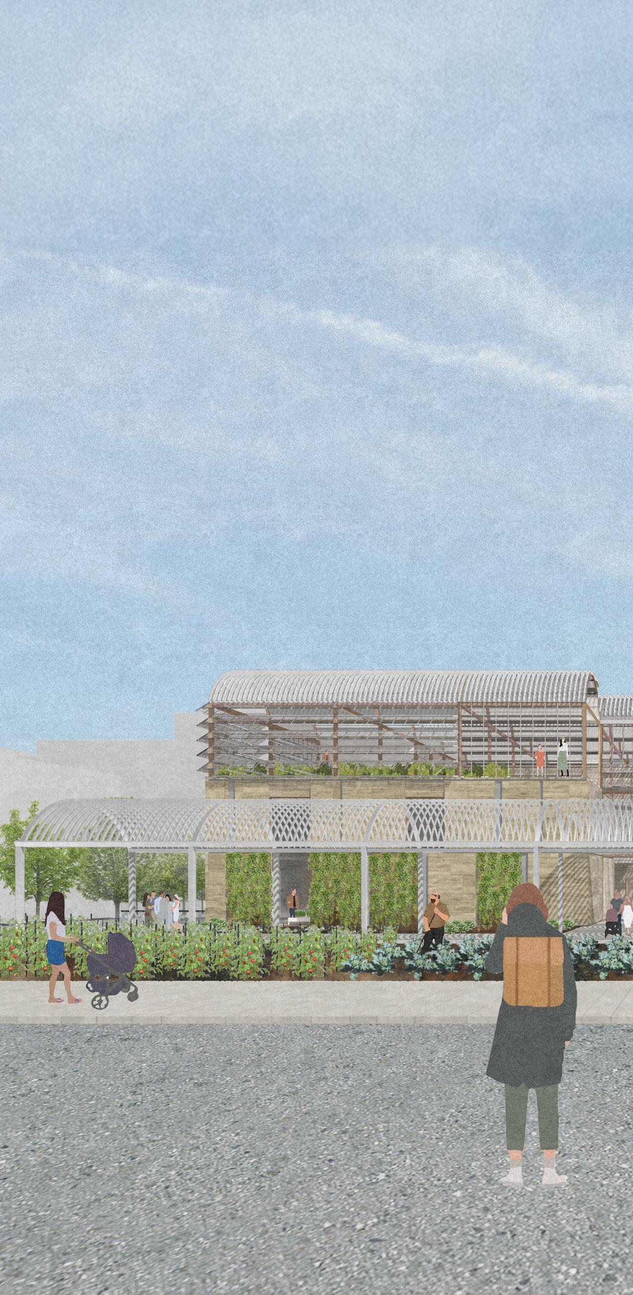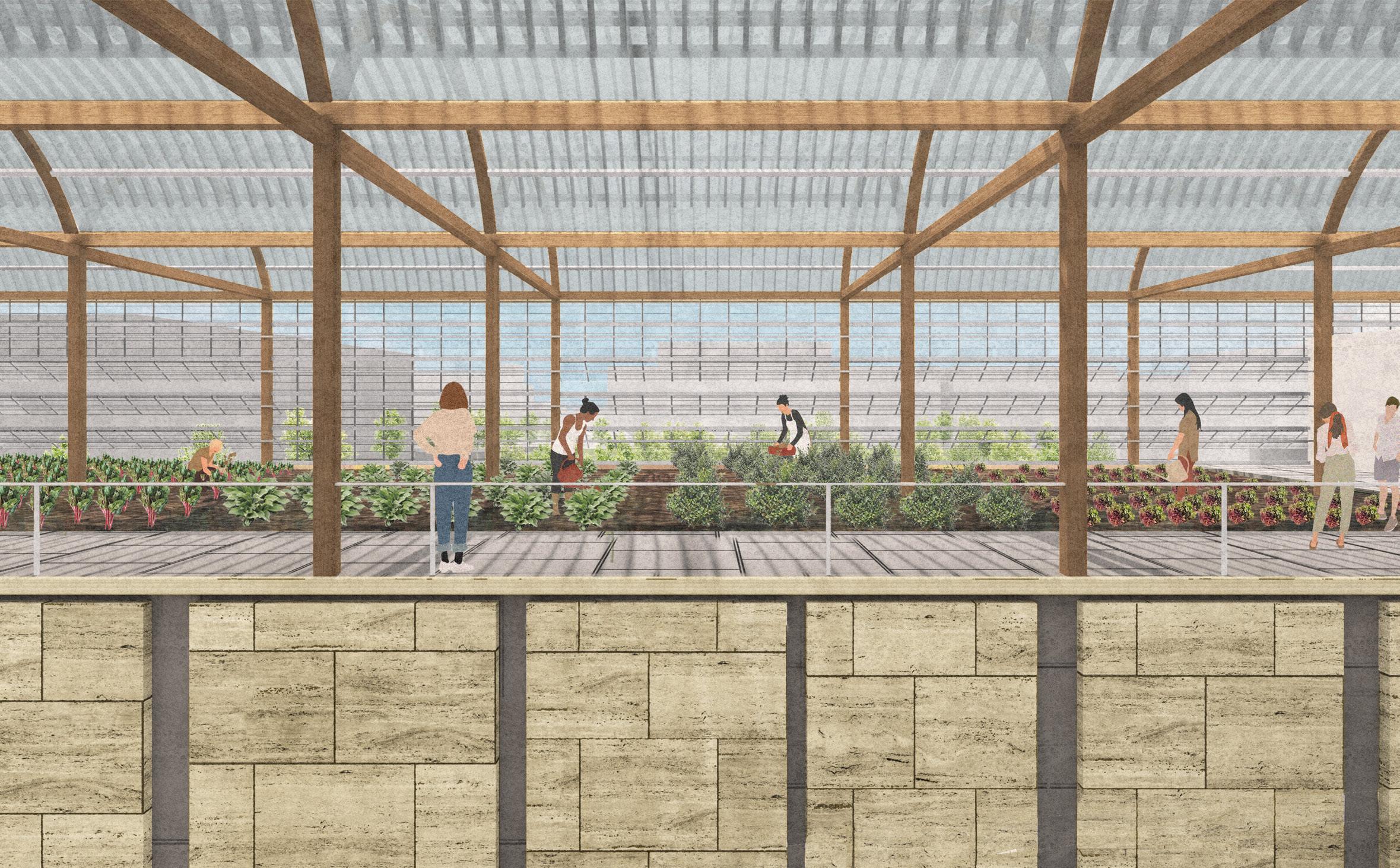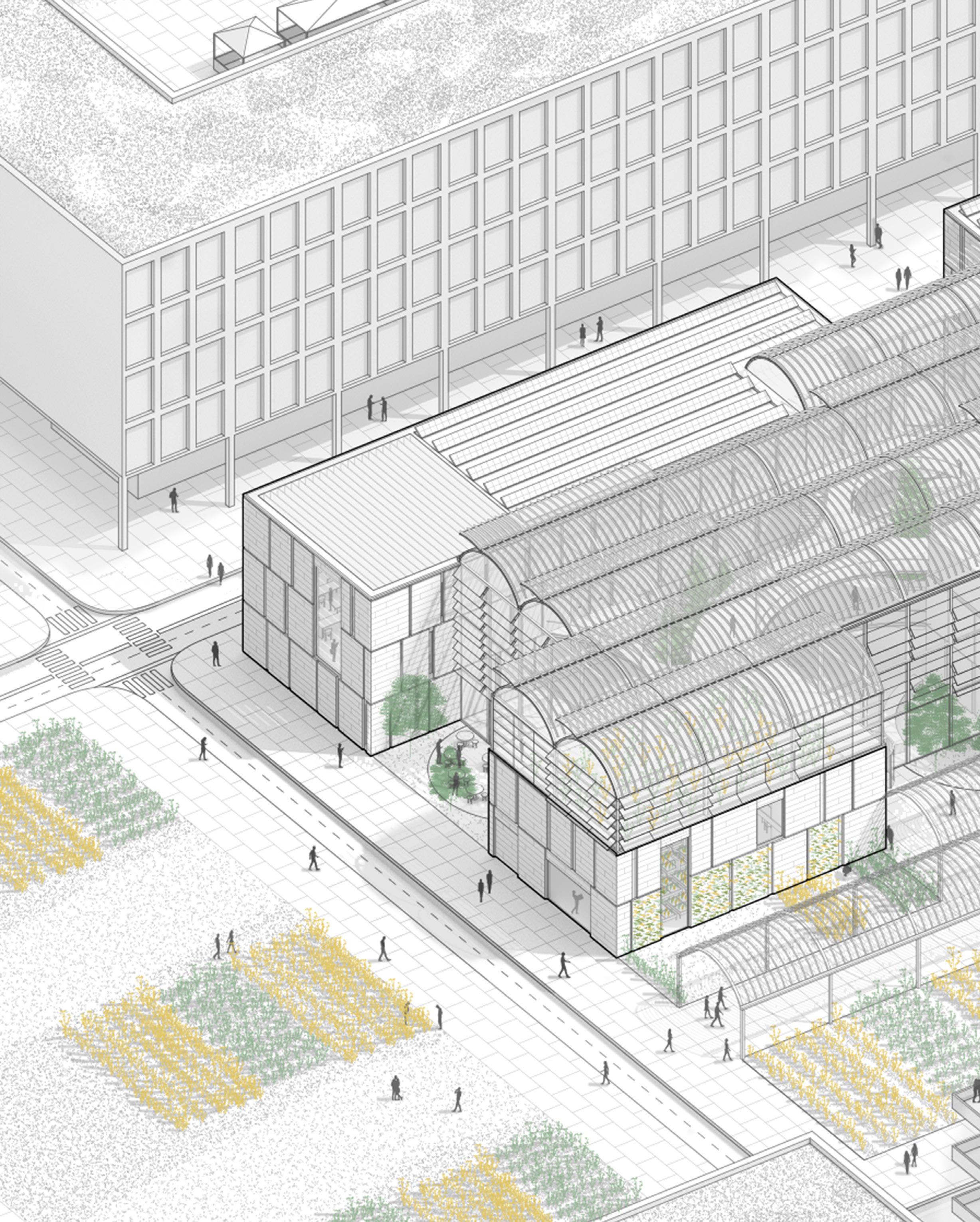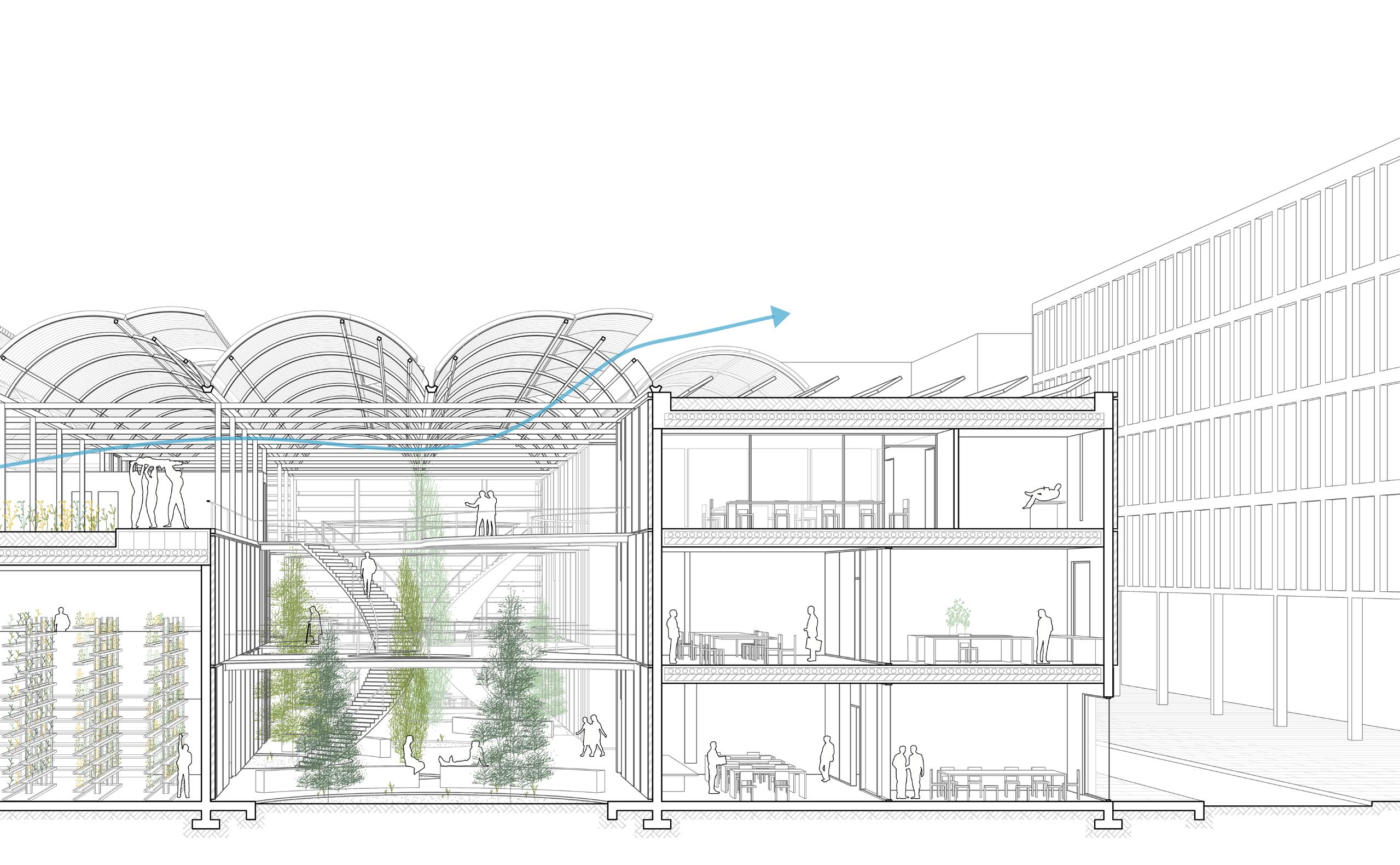 The roof contains integrated bioclimatic systems that protect the climate using automated louvres on the north faces that enable ventilation, water collection between valleys, and sun-reflecting louvres. The roof produces a syncopated rhythm due to repetitive louvres, adding distinctive shadow conditions to the interior. However, the facade aims to break up the rhythm with varyingsized stone panels. Some panels were removed for windows, and others on the south facade were turned into farming panels interacting with the farm in front.