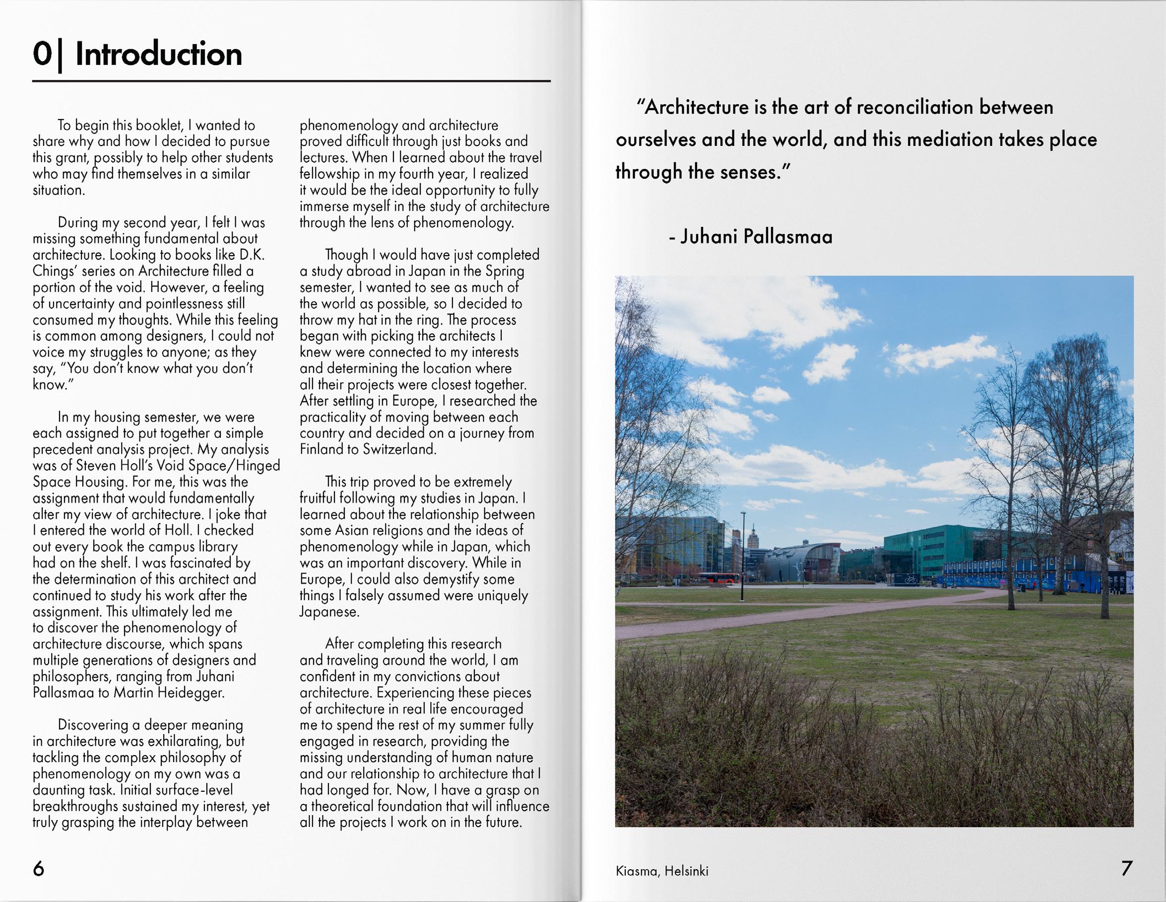 This booklet investigates Northern European phenomenological architecture, focusing on the sensory and experiential connection between humans and their built environment. Through a travel fellowship, the study examines works by architects like Peter Zumthor and Steven Holl, offering insights into how architectural spaces evoke emotions, embody cultural narratives, and resonate with their contexts. It highlights phenomenology’s role in shaping meaningful, embodied interactions with architecture, proposing it as a foundation for future design practices.