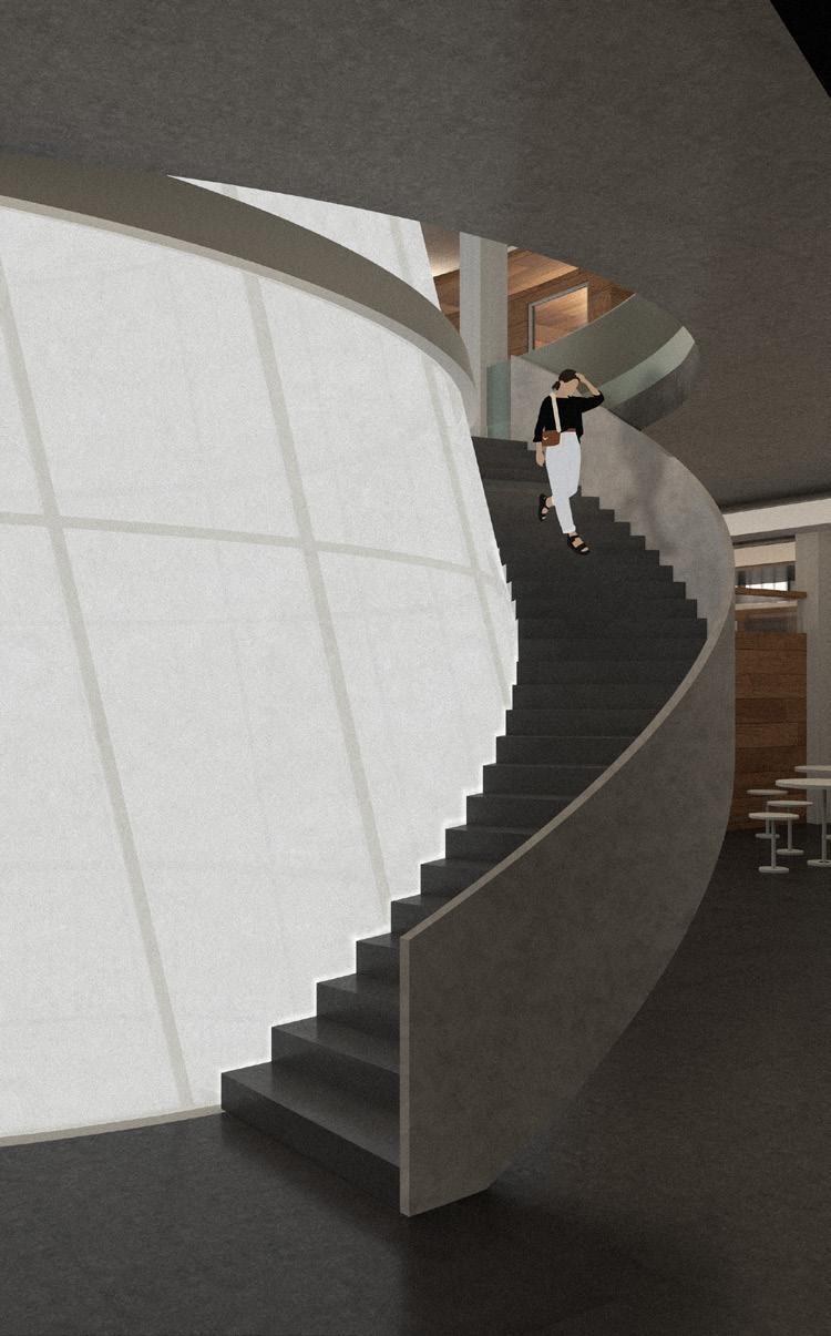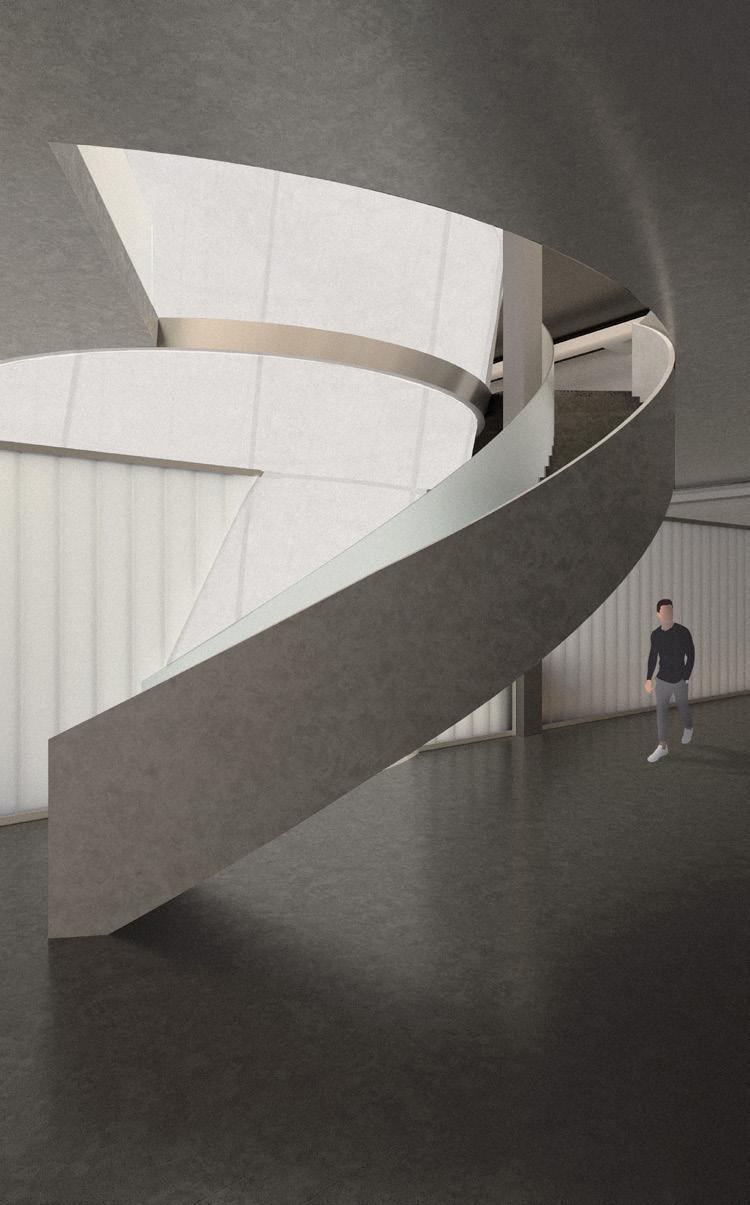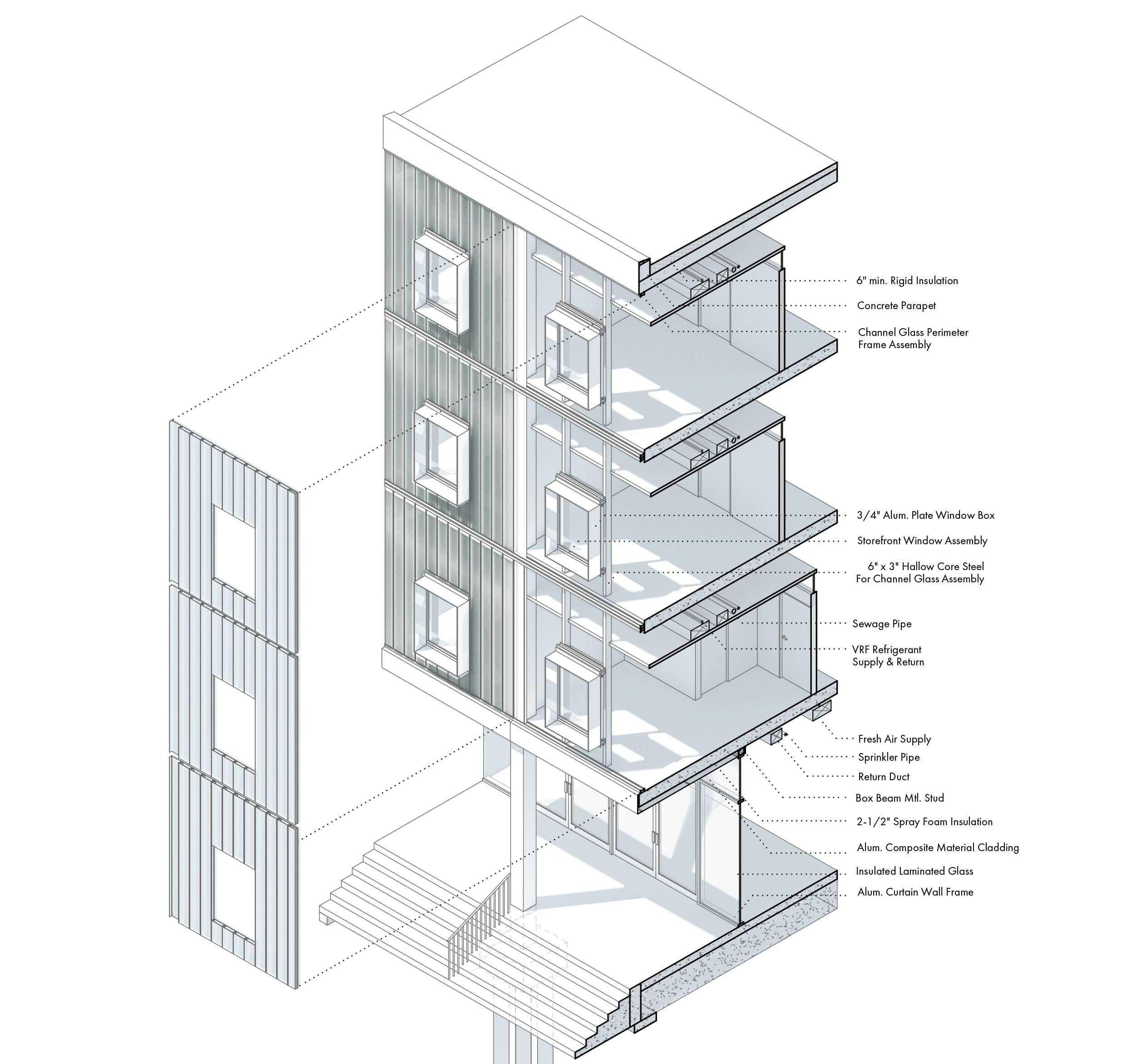 The facade facing each street is made of channel glass and relates to the history of the creation of Jazz on the site. This connection is seen by allowing the facade to take on a “loud” ephemeral appearance at night, but quiet intake of light during the day. The VRF mechanical system tries to hide itself by resting on top of lids on each room, or hovering over the circulation path. Finally, circulation is either found by taking the vertical cores or a monumental stair case which goes through the center of the project and weaves through the funnel.