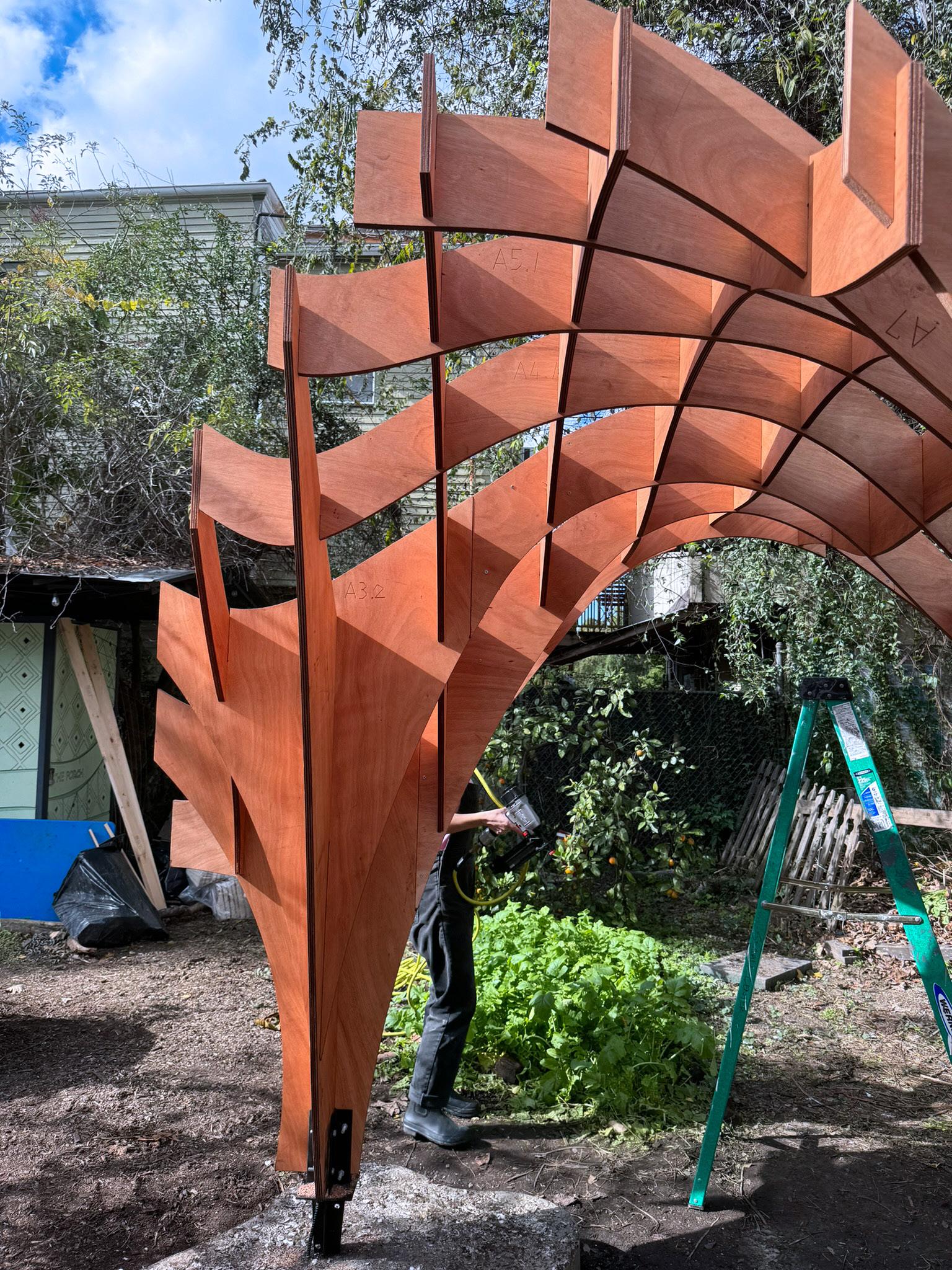 Located at the original solitary garden site, a garden bed that enables incarcerated people to grow their own plants, this project’s goal was to create a structure that harmonizes natural/ sustainable materials with contemporary modes of fabrication. The pavilion utilizes homegrown mycelium tiles for the roof (or “hat” as it’s known in natural building), marine grade plywood that was locally sourced, cob with locally sourced material, and oystercrete with local oysters which acted as the “boots” of the project.