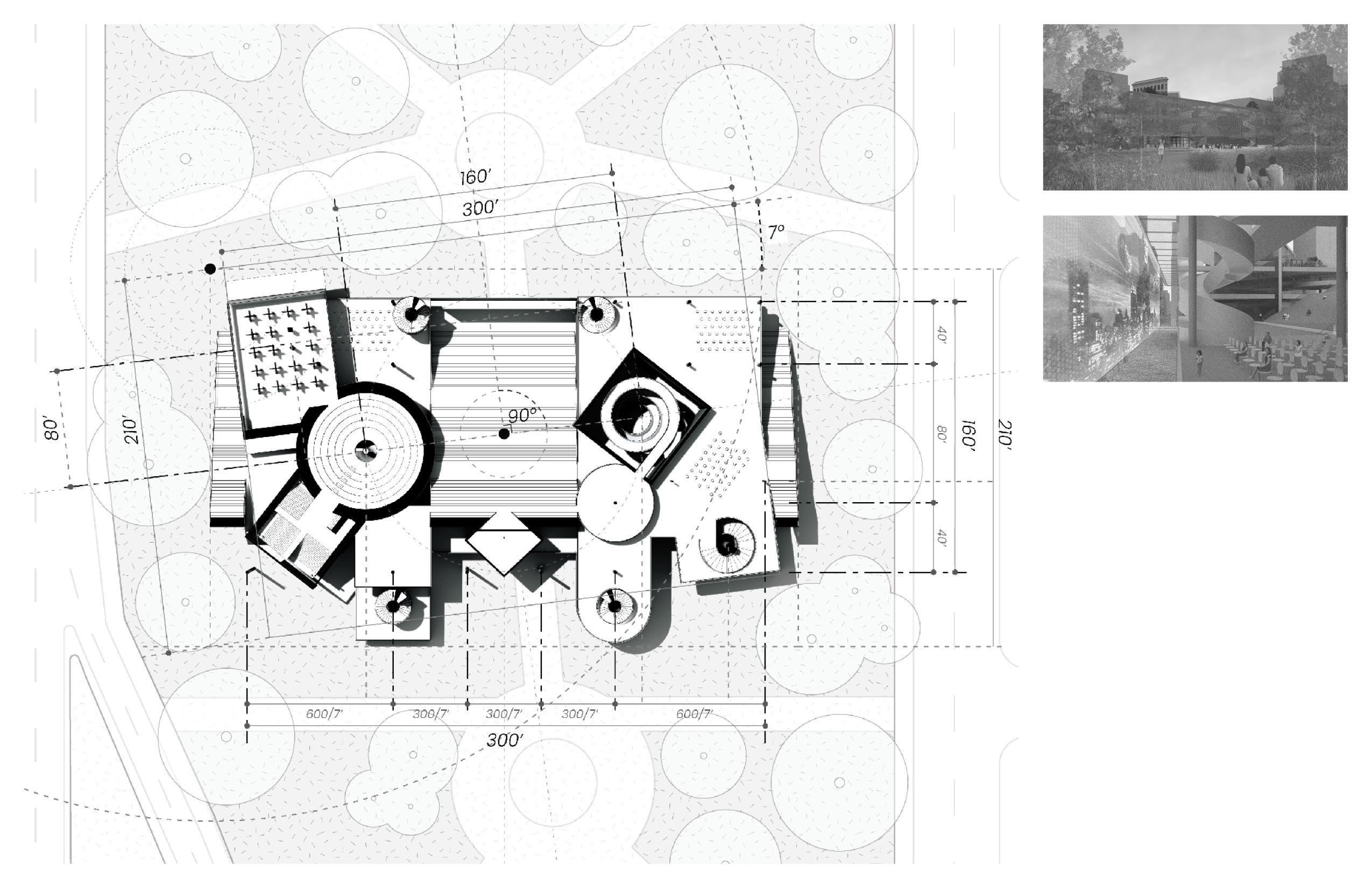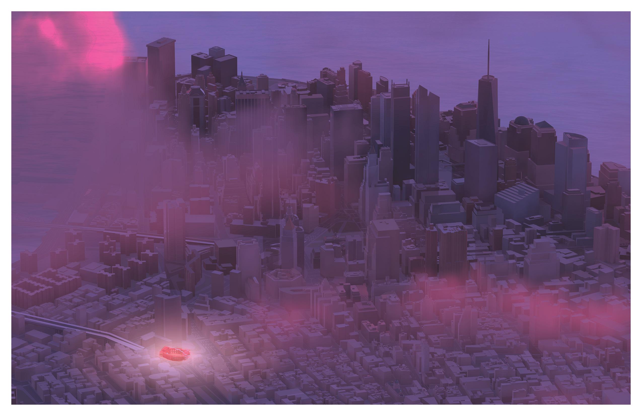 placed a grand seating area oriented toward the Empire State Building, the very first victim of cinema’s architectural violence. This structure responds to its urban context while the geometries establishing a direct visual axis with the building. Just as film has dismembered architecture and reduced it to a backdrop, these abstract geometric pavilions dismember the movie watching platform, transforming it into an altar for architecture.