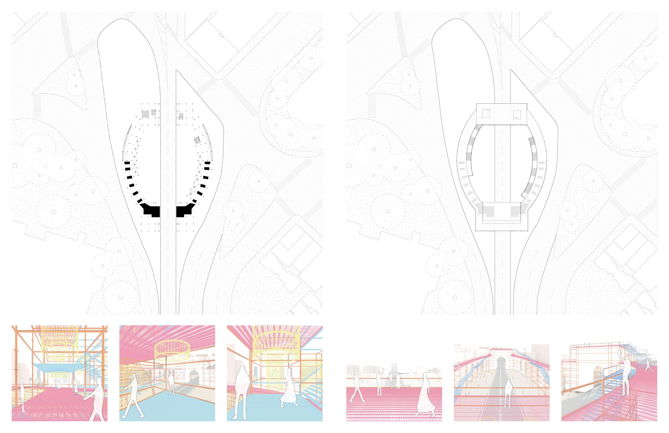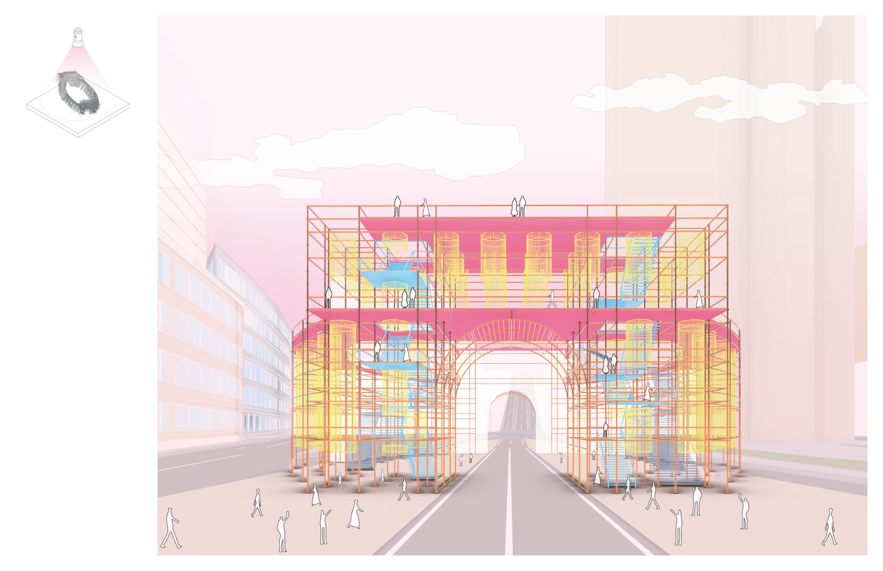 I wanted to embrace the Manhattan Bridge, transforming it from a barrier into a space of connection. Shaped by its surroundings, my design introduces an intuitive stairway leading to a viewpoint, shifting the experience from looking up to engaging with the city. More than scaffolding, it is a flexible framework—an open system inviting people to shape it as their own. Inspired by Chinatown’s rich symbols and ornaments, I integrated their potential into New York’s scaffolding structures, creating a space where cultural expressions and everyday life intertwine. In this vision, the bridge is no longer distant and imposing but embraced by the community, not just through steel and stone, but through human connection.
