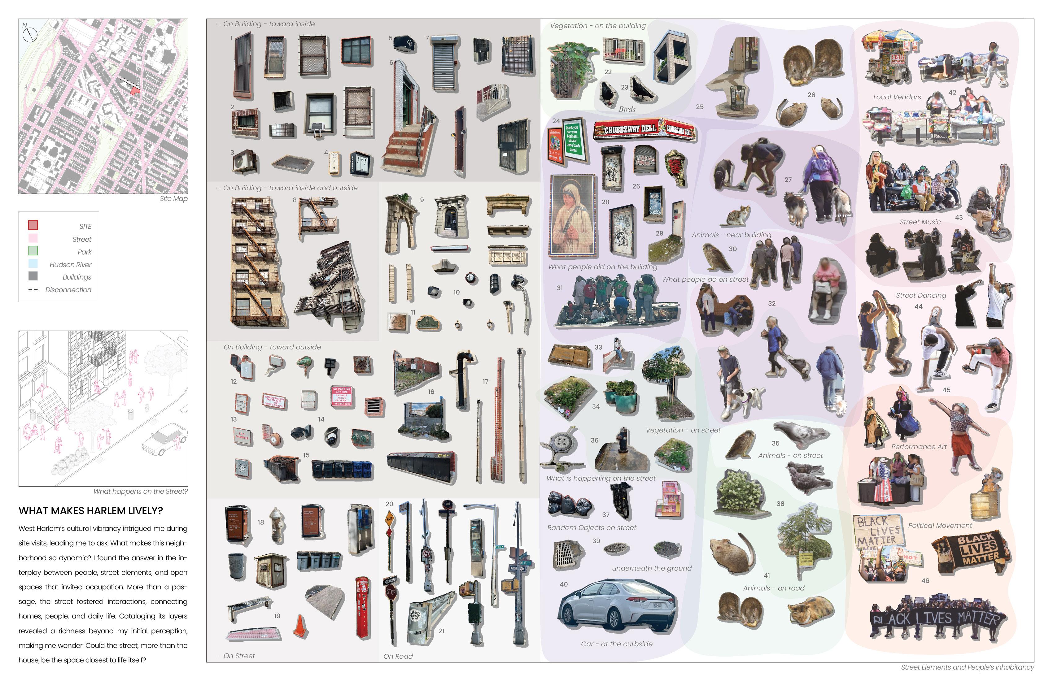 West Harlem’s cultural vibrancy intrigued me during site visits, leading me to ask: What makes this neighborhood so dynamic? I found the answer in the interplay between people, street elements, and open spaces that invited occupation. More than a passage, the street fostered interactions, connecting homes, people, and daily life. Cataloging its layers revealed a richness beyond my initial perception, making me wonder: Could the street, more than the house, be the space closest to life itself?