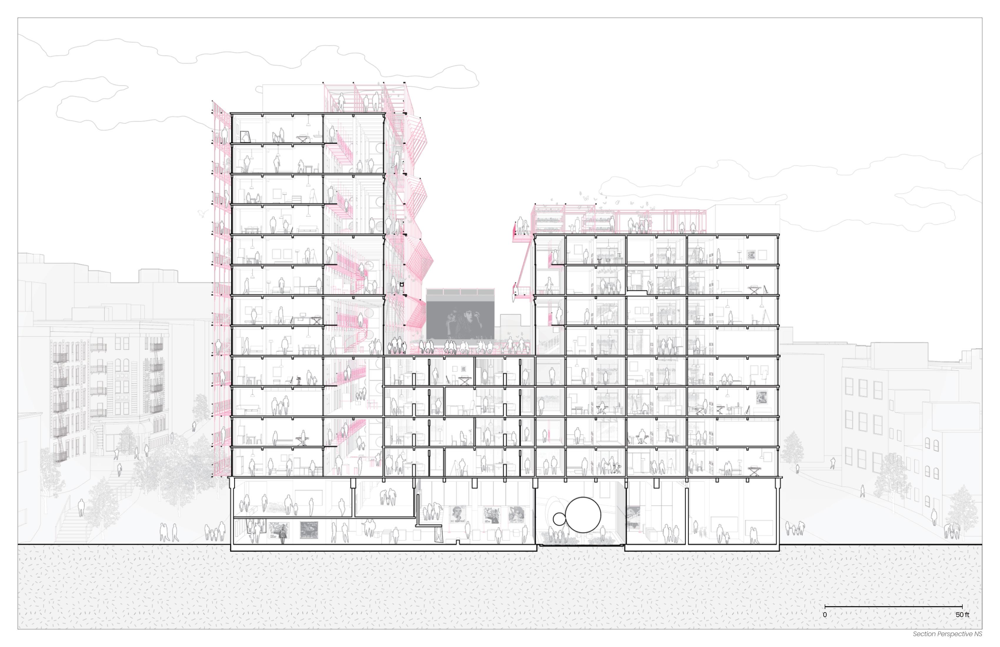 Despite the neighborhood’s vibrancy, this site felt isolated due to elevation differences. To bridge this gap, I integrated a central ramp, seamlessly connecting the site to its surroundings. At its heart, a plaza transforms the passage into a cultural hub, drawing in the community’s energy. Extending further, the ramp and plaza link with ground-floor open spaces and surrounding streets, echoing NYC’s grid.
