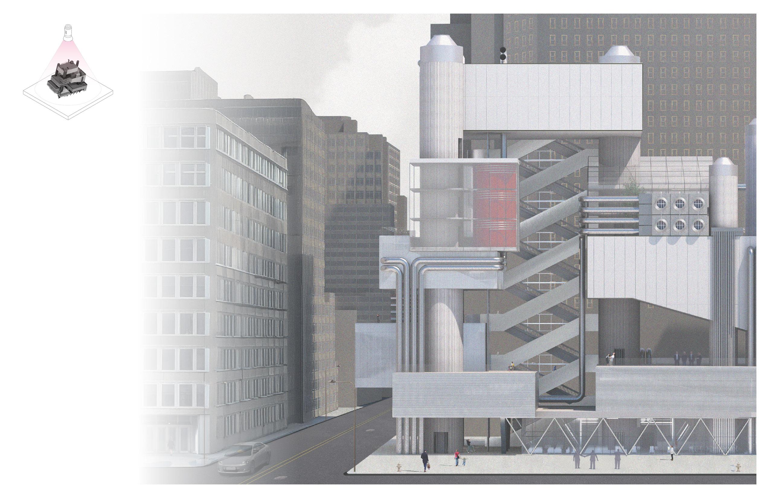 Instead of letting this heat go to waste, we chose to recycle it—using it to warm both water and air. As a result, the building is wrapped and intersected by an extensive network of pipes, which may at first appear excessive. These pipes serve as medium for heat transfer, visibly weaving in and out of the structure, ultimately shaping the building’s unique identity.