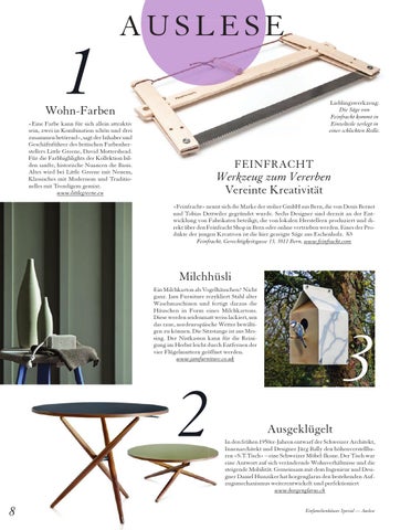 Werkzeug zum Vererben Vereinte Kreativität «Feinfracht» nennt sich die Marke der stolier GmbH aus Bern, die von Denis Bernet und Tobias Dettwiler gegründet wurde. Sechs Designer sind derzeit an der Entwicklung von Fabrikaten beteiligt, die von lokalen Herstellern produziert und direkt über den Feinfracht Shop in Bern oder online vertrieben werden. Eines der Produkte der jungen Kreativen ist die hier gezeigte Säge aus Eschenholz. KS Feinfracht, Gerechtigkeitsgasse 13, 3011 Bern, www.feinfracht.com