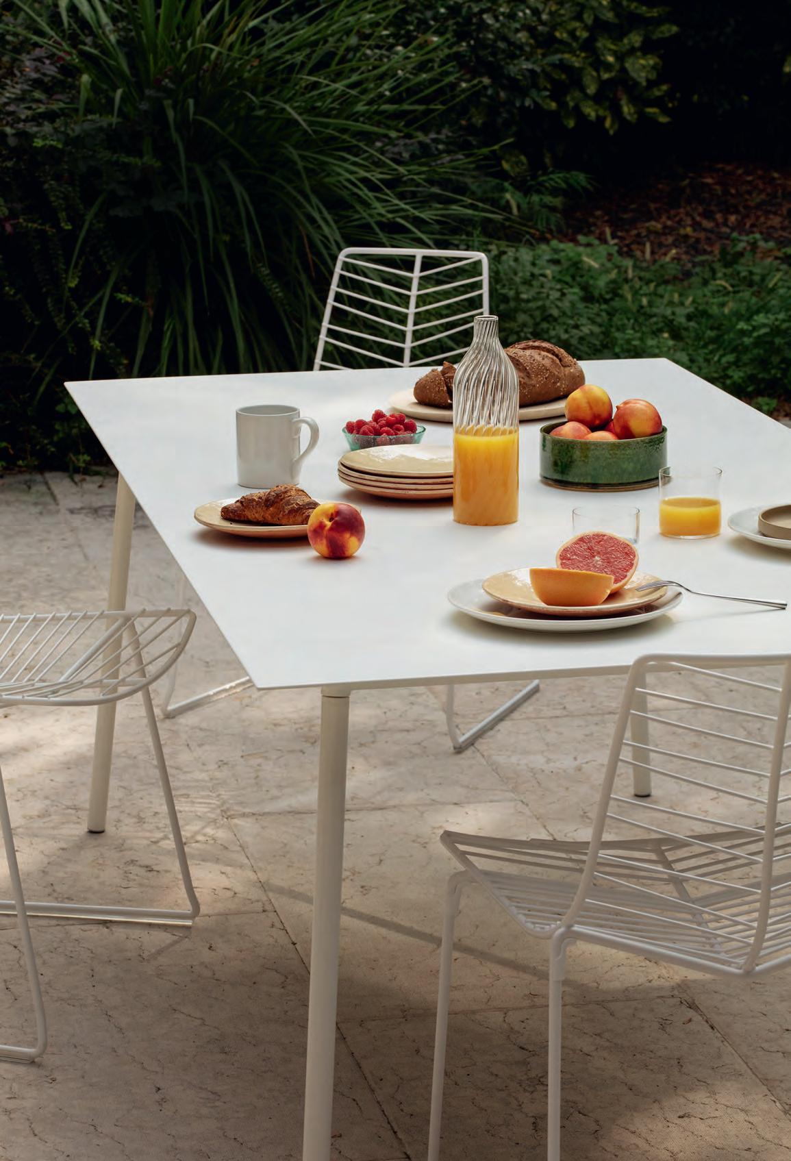 Ein Tisch darf im Gartenesszimmer ganz klar nicht fehlen. Beispielsweise das Modell «Rayan Outdoor», das mit seiner satten Farbe und seinem ikonischen Design ein wahrer Hingucker ist. Bei der Platte kann zwischen Lavastein und Gussglas gewählt werden, das Gestell besteht aus Edelstahl. www.minotti.com