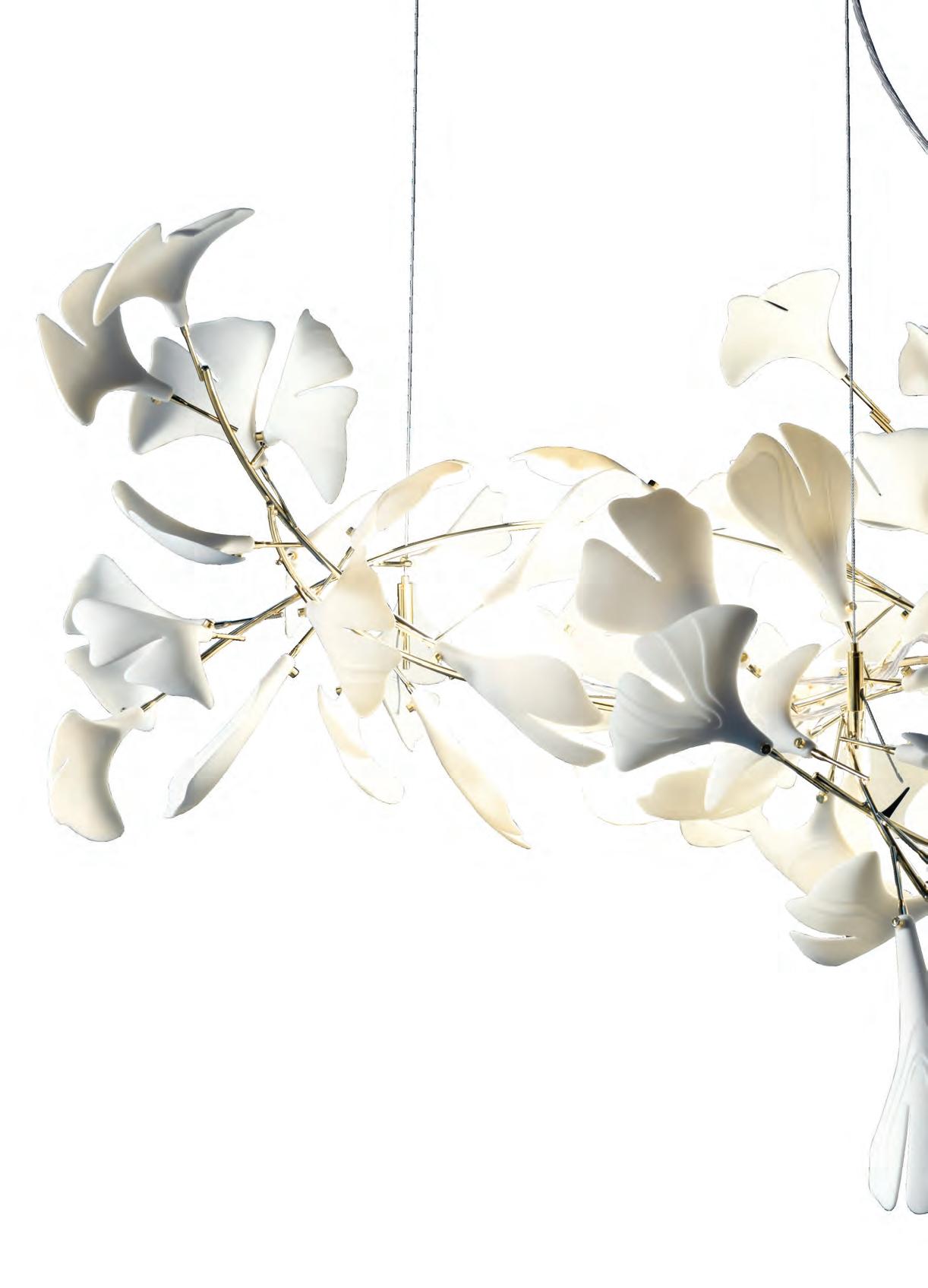 ynamisch und verspielt, kraftvoll und zugleich filigran mäandern die Blütenblätter um Zweige und Drähte von der Decke hinunter. Selbst im ausgeschalteten Zustand wirkt die riesige Skulptur aus feinstem Porzellan lebendig, als würde der Wind die Blätter in Bewegung setzen. Andreea Braescus Lichtinstallationen und Kronleuchter sind atemberaubend. «Mein Wunsch ist es, den Räumen Leben einzuhauchen und das Gefühl von Harmonie und Frieden zu vermitteln, das uns die Natur schenkt, wenn wir draussen sind, glücklich und frei», erklärt Braescu. Die Arbeiten der preisgekrönten Künstlerin streben danach, die Essenz und Energie der Natur in Innenräume zu übertragen. «Ich bin ständig inspiriert von der Schönheit und Komplexität der natürlichen Welt, insbesondere von der Art und Weise, wie sie durch scheinbare Zufälligkeit Harmonie schafft. Jedes Blatt an einem Baum ist einzigartig, aber zusammen schaffen sie ein Muster, das es jedem Blatt ermöglicht, das nötige Sonnenlicht zu erlangen, um zu gedeihen und zu wachsen.»