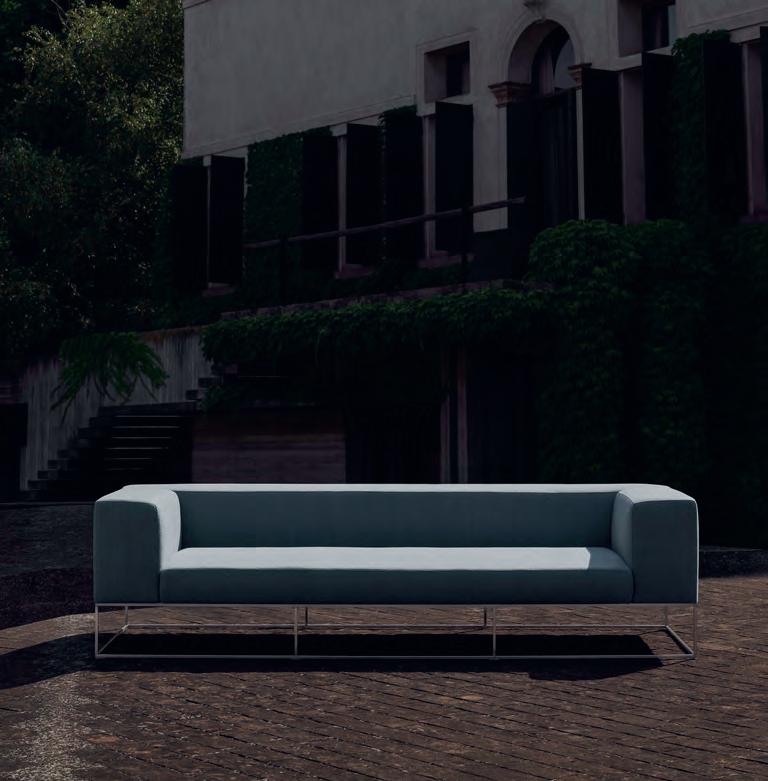 Im Zwielicht wirft die lineare Struktur des Sofas «Ile Club» einen aufregenden Schatten. Der Sitzrahmen aus lackiertem Edelstahl und die Polsterung mit Federkern geben sanfte Stabilität für angenehmes Sitzen, bis die Nacht auch die Schatten ins Dunkel taucht. www.livingdivani.it