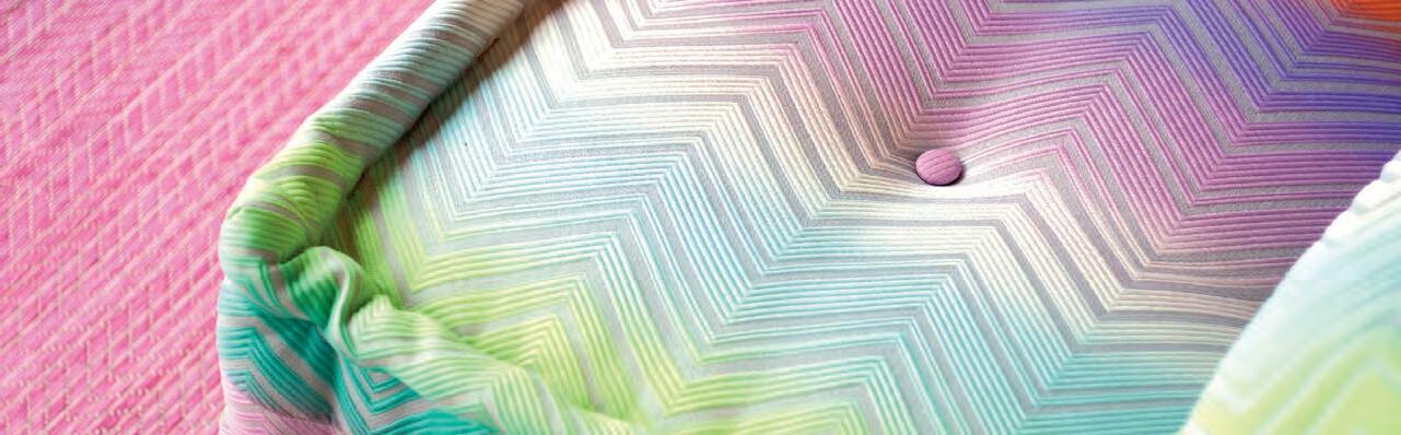 Für den Aufenthalt seines Kultsofas im Freien hat sich Roche Bobois mit dem Modehersteller Missoni zusammengetan und ein fröhliches Pastelluniversum entworfen, das mit sanften Farben die Gartensaison willkommen heisst. Die Struktur des Sofas stammt aus nachhaltig bewirtschafteten, FSC-zertifizierten Wäldern. Das perforierte Metallgestell, lackiert und mit Katapho-
