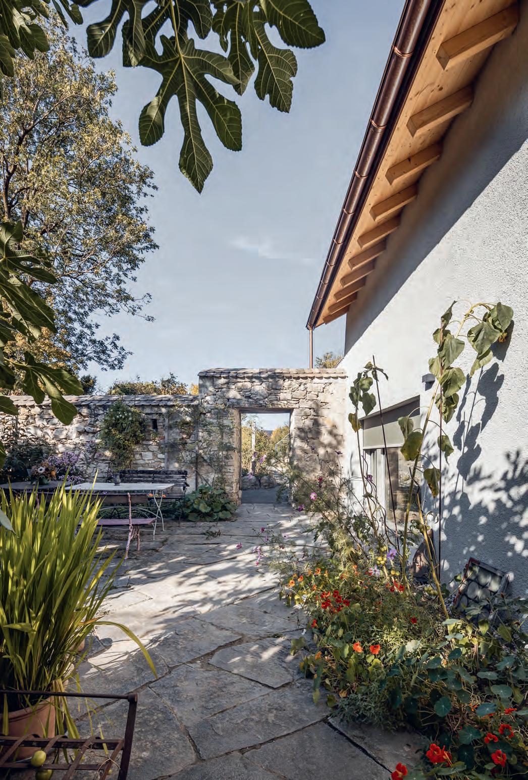 Anstelle des Schopfs lehnt sich nun ein kleines Wohnhaus an die alte Bruchsteinmauer, die den bestehenden Sitzplatz mit Steinplatten und Nutz- und Zierpflanzen einfasst.